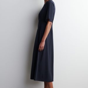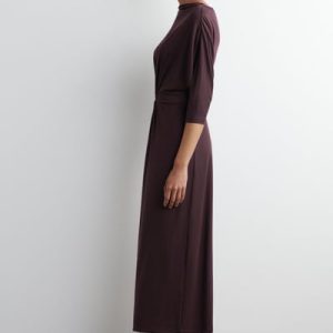 Softly draped silhouettes bring a modern femininity to the womenswear collection. This asymmetric dress is crafted from fluid modal jersey and designed with an angular dropped waist and flowing midi hem. The dark-tangerine tone is key for the season.