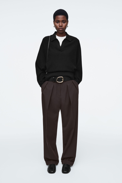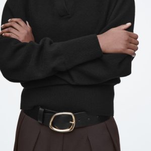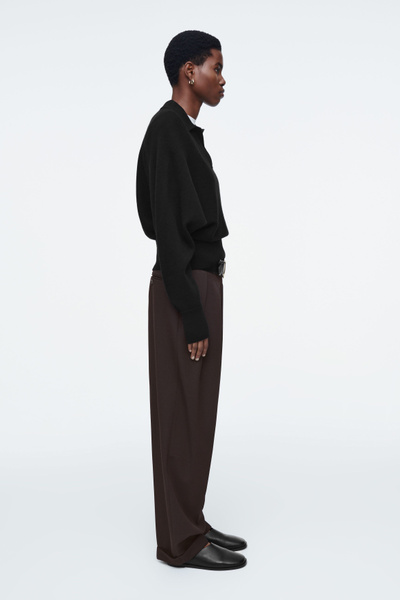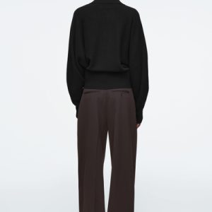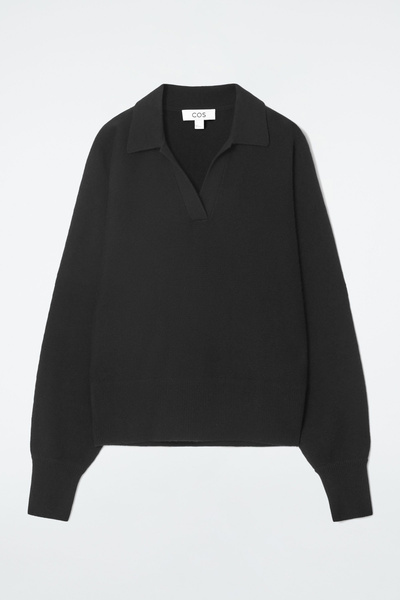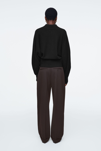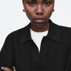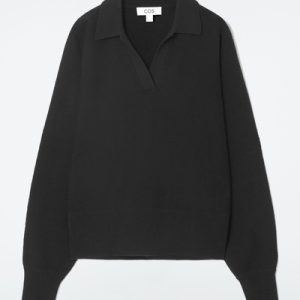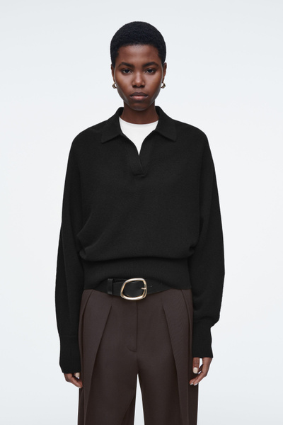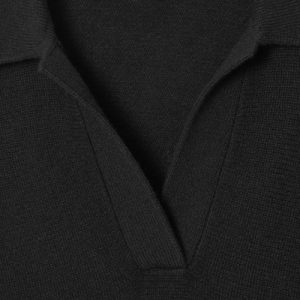 The womenswear team propose a refined take on sportswear codes for Pre-Fall 2024. This polo-inspired sweater is knitted from pure RWS wool in an enduring black tone and has an open collar, batwing sleeves and a wide ribbed hem.