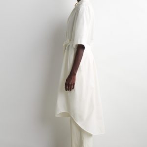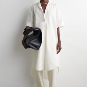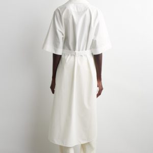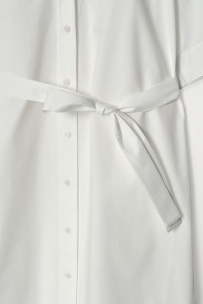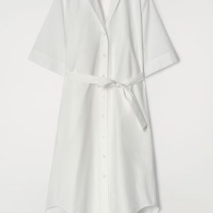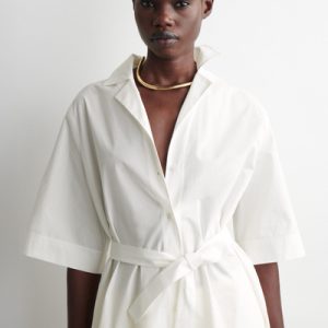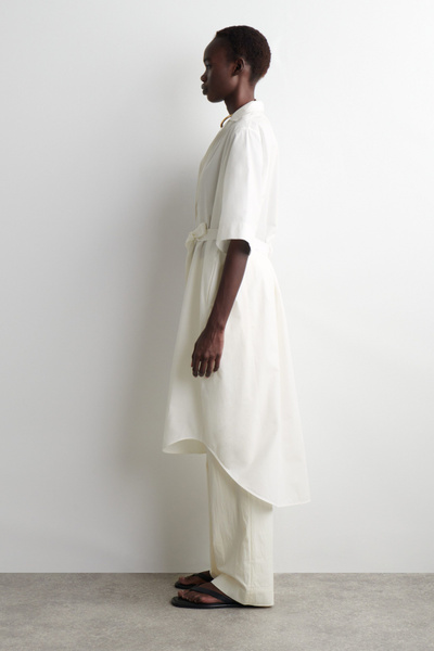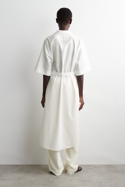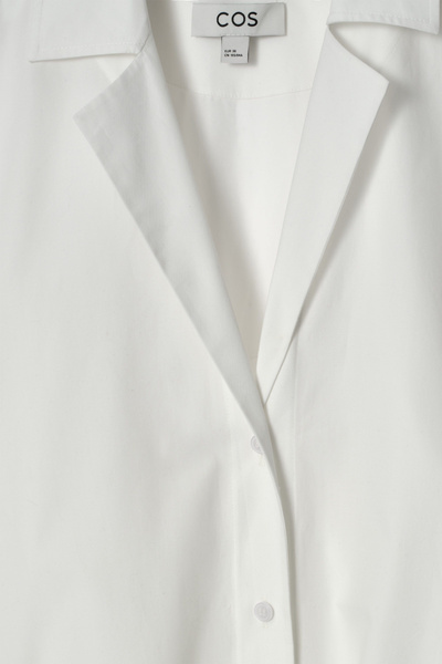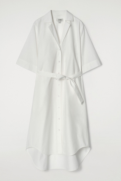The COS womenswear team reimagine the shirt dress for Spring Summer 2025. Crafted from pure cotton-poplin, it’s designed with a camp collar, wide short sleeves and a tiered, rounded hem. Cinch the tonal belt around your waist.