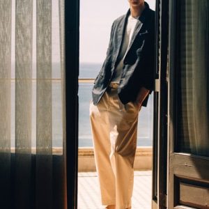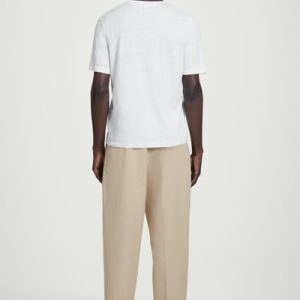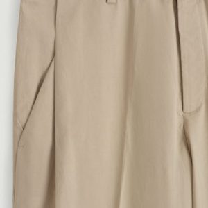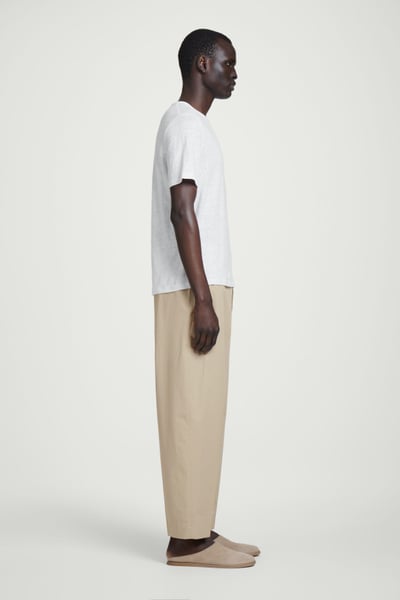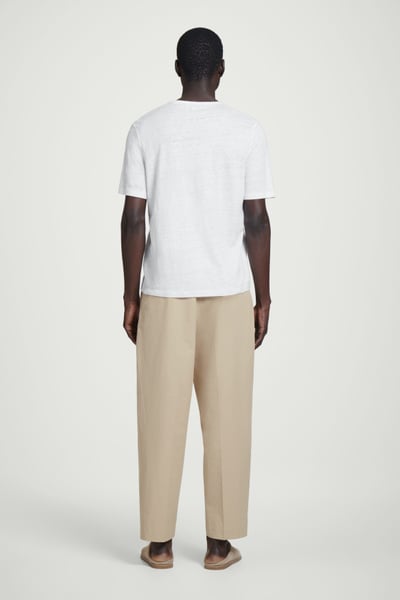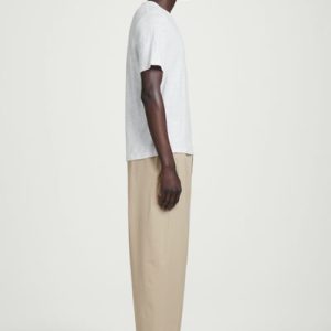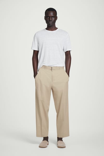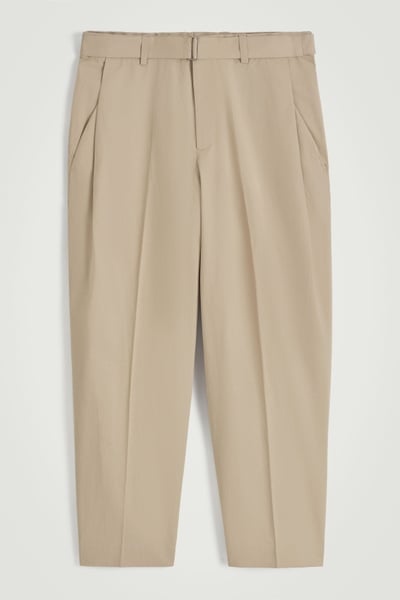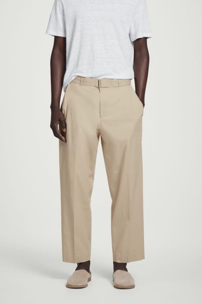 Offered in versatile beige, these tapered pants are crafted from premium Pima cotton and shaped with sharp pleats at the front. The neat welt pockets borrow from tailoring, while the D-ring belt lends subtle definition to the relaxed shape.