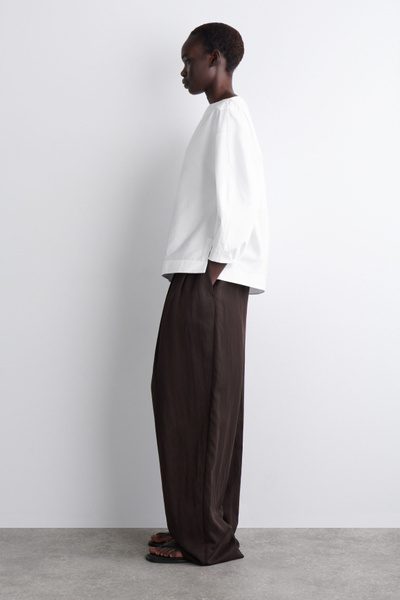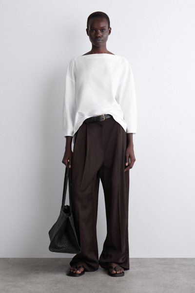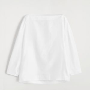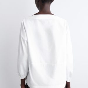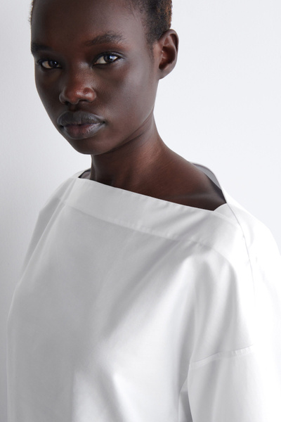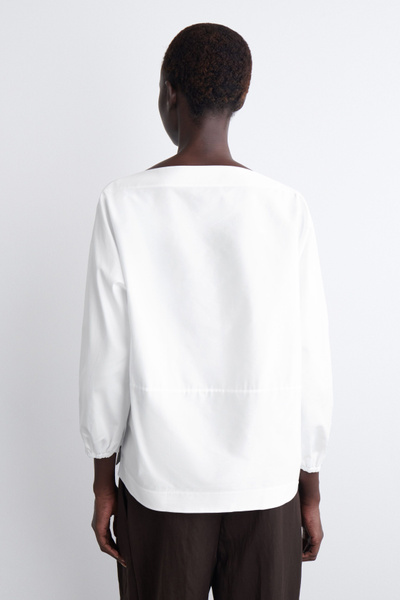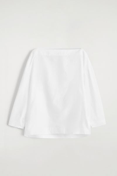 Crafted from soft cotton, this blouse is designed with an elongated boat neckline that frames the décolletage and has slightly cropped sleeves that subtly gather at the cuffs. Style it with tailoring or classic denim.