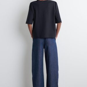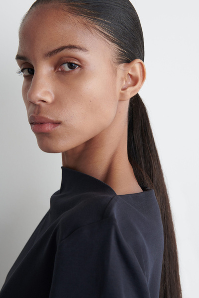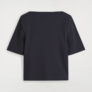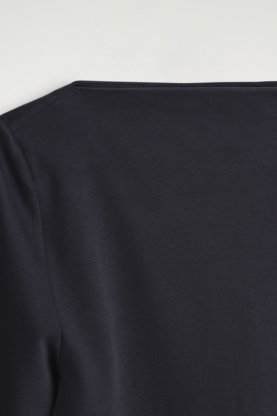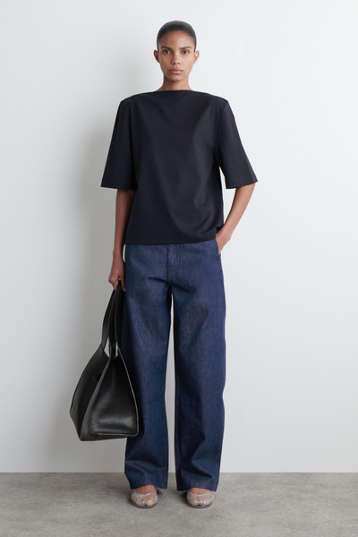 Modern silhouettes and premium fabrics are pillars of the COS design language. Crafted from 230gsm cotton-jersey, this navy T-shirt features a boat neckline, fluid short sleeves and shaped seams that subtly define the waist.