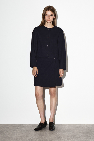 The COS womenswear team referenced ’90s minimalism when designing this mini skirt. Rendered in classic navy, it’s made from a premium merino-wool blend that’s boiled for a luxurious handle and shaped in a wrap-front silhouette. Style it as a co-ord with the matching cardigan.
