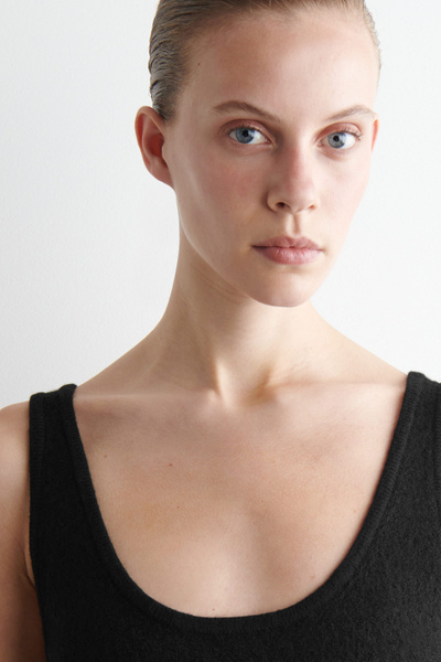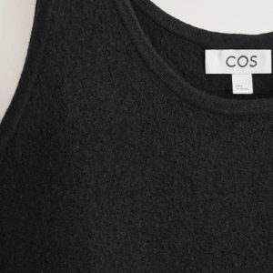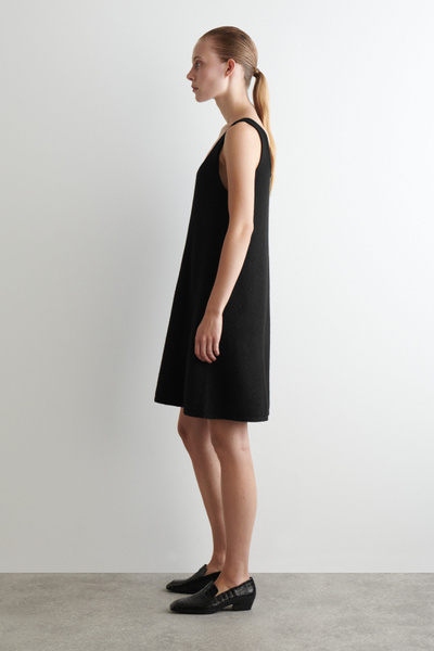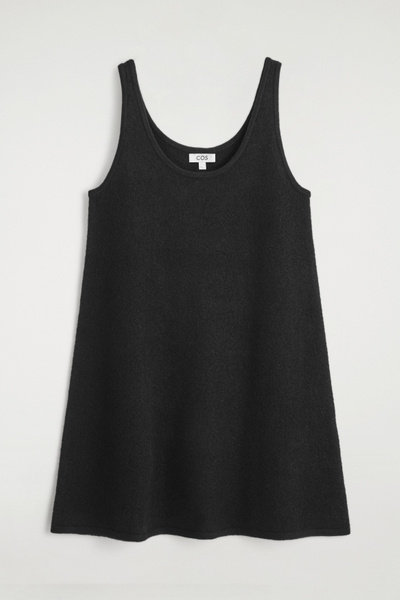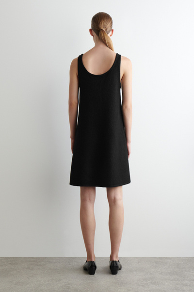 Inspired by ’60s silhouettes, this mini shift dress is crafted from merino wool that’s boiled for a textural finish. It’s cut in an A-line shape and features a scooped neckline with neat tubular edges. Style it over pants for a modern take.