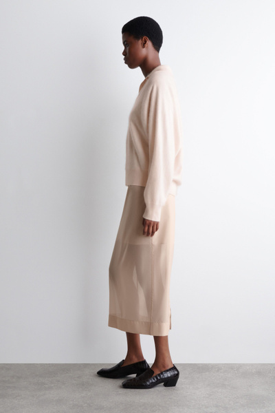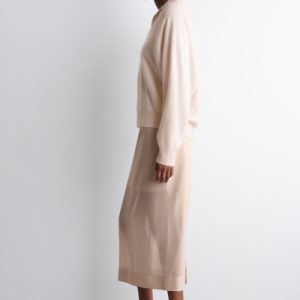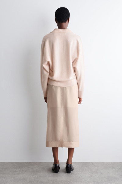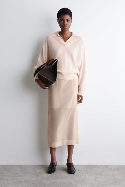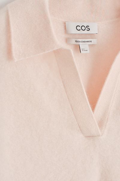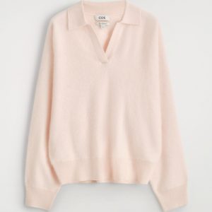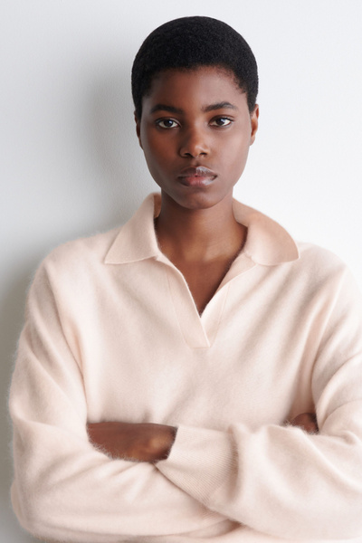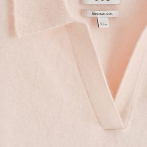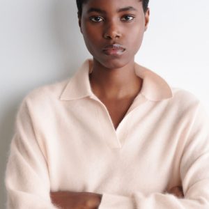 The classic polo is renewed with textural appeal for Pre-Fall 2025. It’s knitted from Good Cashmere Standard® cashmere that’s brushed for a soft, tactile hand feel and comes in a subdued pink tone that will style effortlessly with the other pieces in your wardrobe. The open collar and batwing sleeves create an effortless shape.
