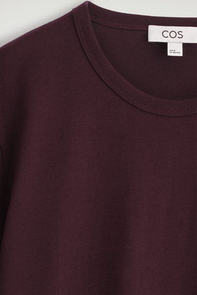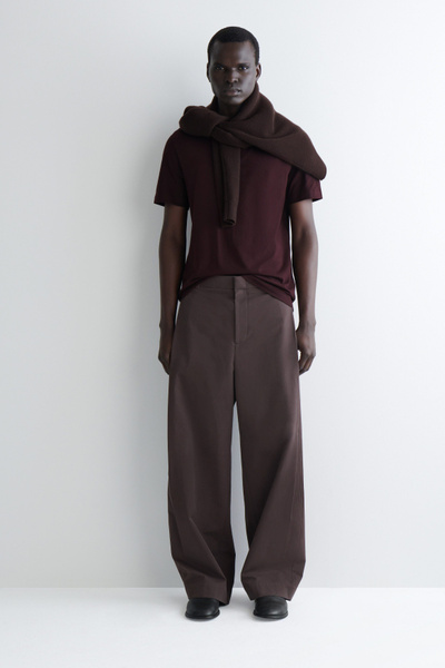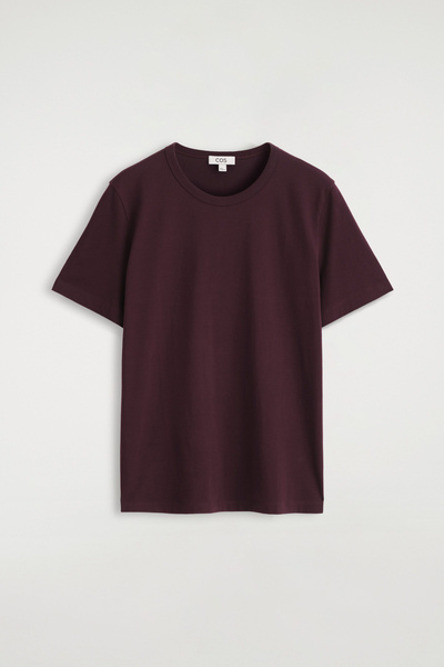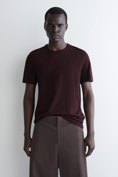The brushed T-shirt has been a cornerstone of the menswear collection from day one. Offered in a deep burgundy tone, it’s crafted from 160gsm cotton-jersey that has a luxuriously soft feel and cut in a classic shape that sits neatly with room for movement. The ribbed crew neck maintains its form after wear.