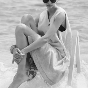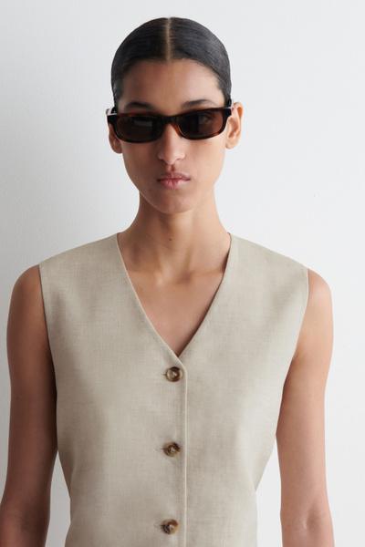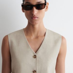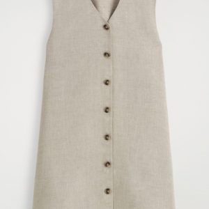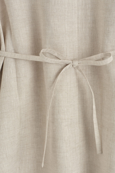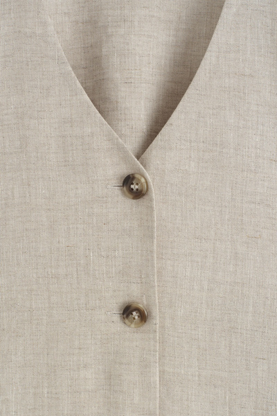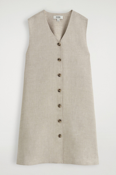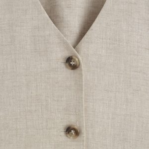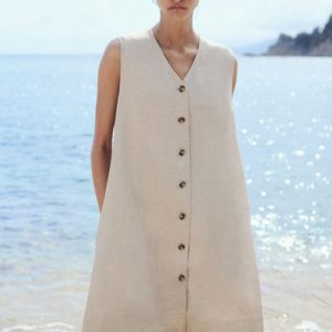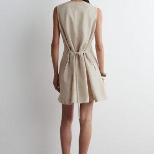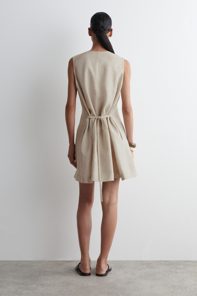 This mini dress reimagines tailoring codes for the spring/summer wardrobe. Crafted from light European Flax™ linen, it’s designed with a V-neckline, vest-style buttons and back ties that define the shape. The muted oatmeal hue is a natural choice for sun-drawn days.