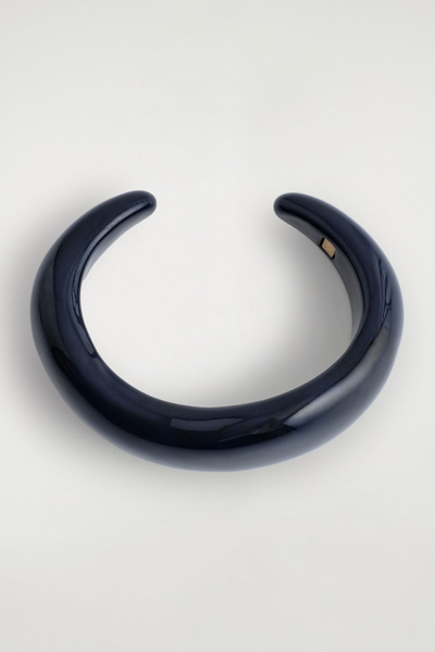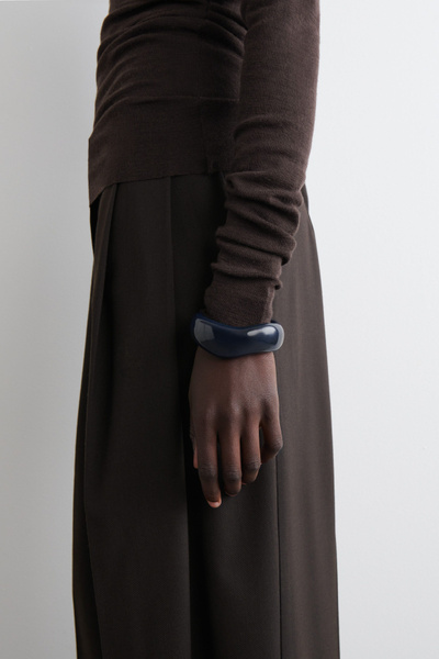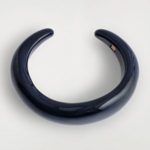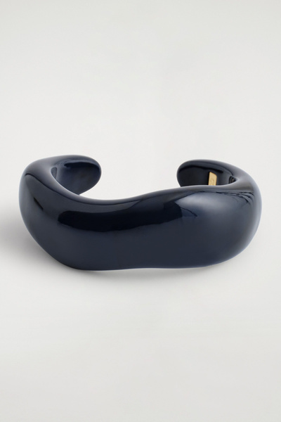 This modern bangle offers an effortless way to accent your outfit. It’s made from soft-shine resin in a deep blue hue and sculpted in an undulating shape that curves around the wrist. Style it over the cuff of your shirt.