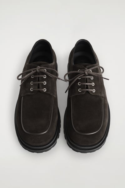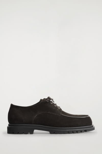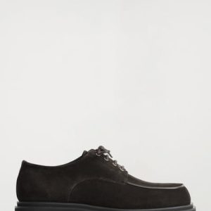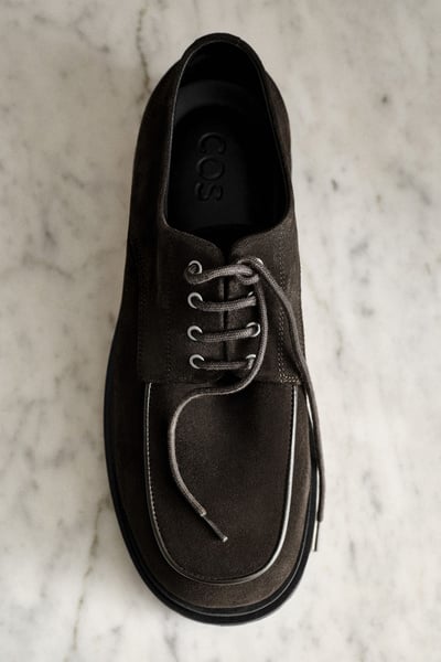 This season, the menswear team modernizes the classic Derby shoe. This refined pair is crafted from premium suede in a rich espresso tone and features rounded toes, stitched details, and chunky yet lightweight soles. Style them with tailoring or denim.
