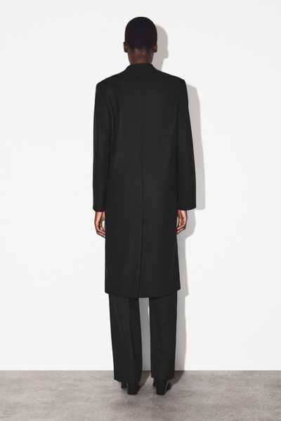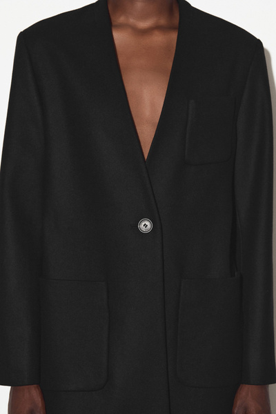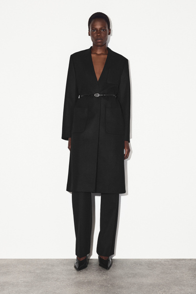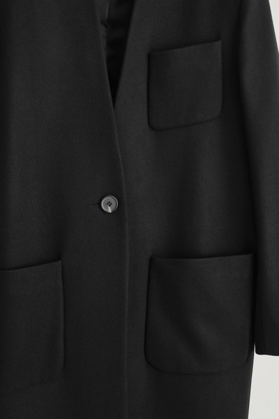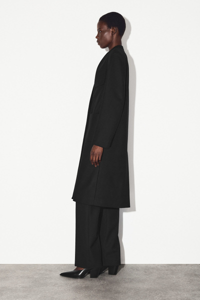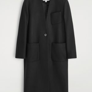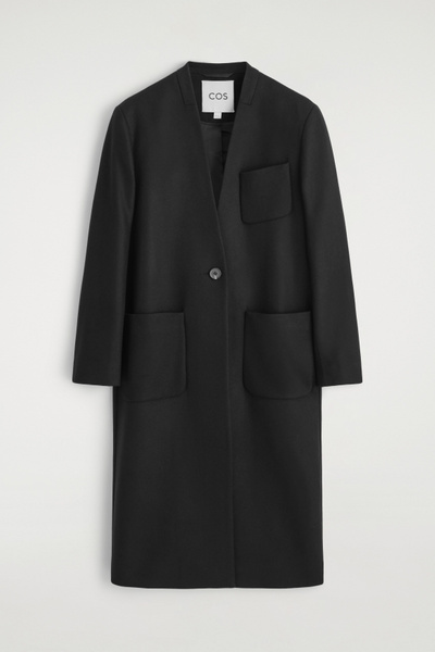 The COS outerwear collection is defined by premium fabrics, classic silhouettes and modern sophistication. This collarless coat is made from Melton wool with a hint of cashmere for a luxurious hand feel and features three pockets and a vent at the back.