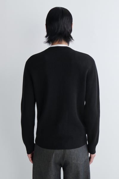 This timeless sweater will transition your wardrobe into the cooler seasons ahead. Offered in versatile black, it’s knitted from light yet tactile cotton and features a ribbed crew neck, cuffs, and hem. Style it with classic denim.