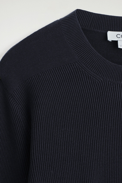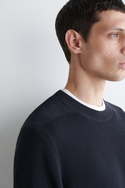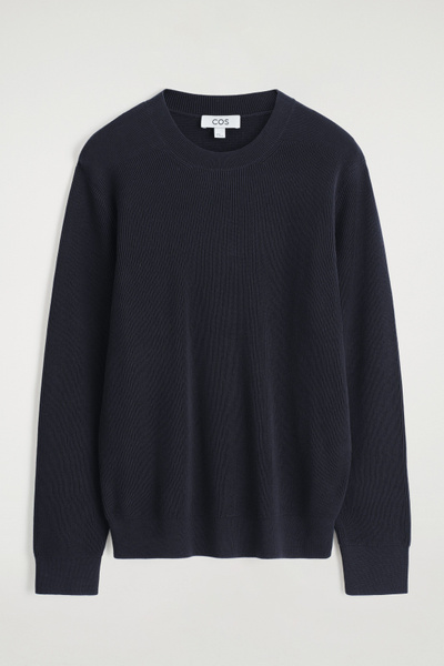 Introducing Wardrobe Essentials: a curation of COS signatures defined for the season. This timeless sweater will transition your style into the cooler seasons ahead. Offered in versatile navy, it’s knitted from light yet tactile cotton and features a ribbed crew neck, cuffs and hem. Pair it with classic denim.