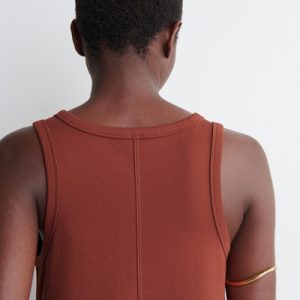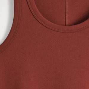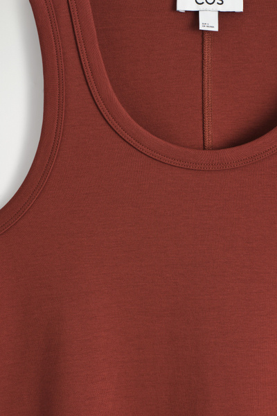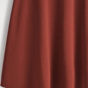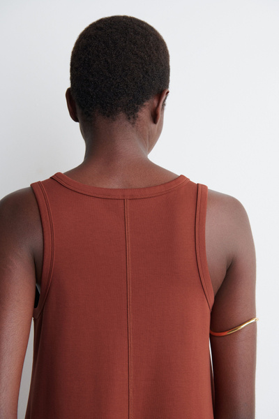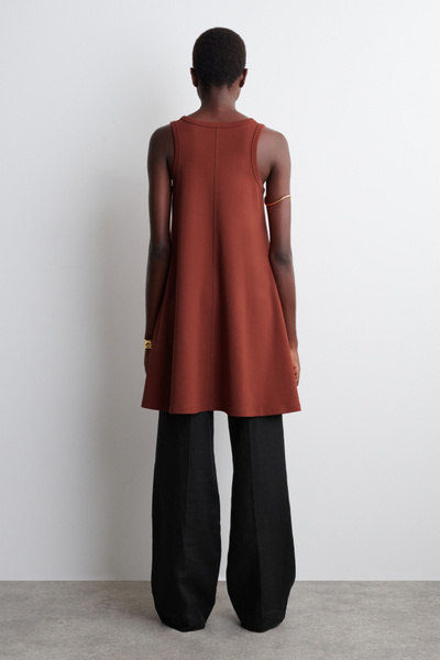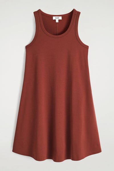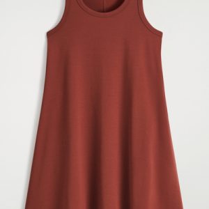 Rendered in a saturated brick-red tone, this modern mini dress is designed in a sleeveless shape with a flared swing skirt and subtle pockets. It’s crafted from soft organic-cotton jersey, chosen for its soft handle and natural lightness.
