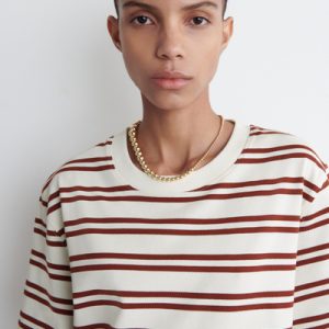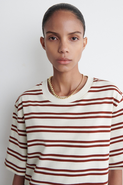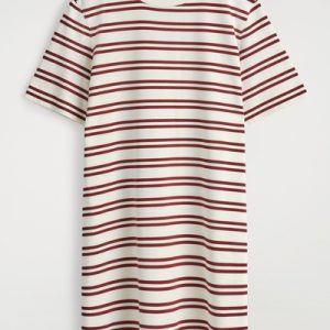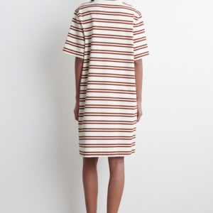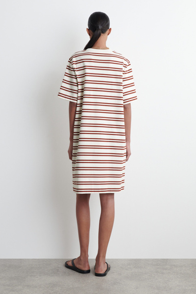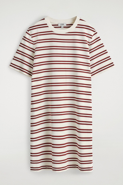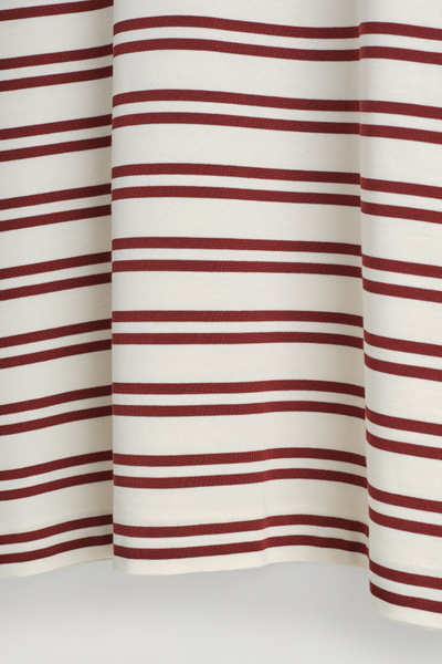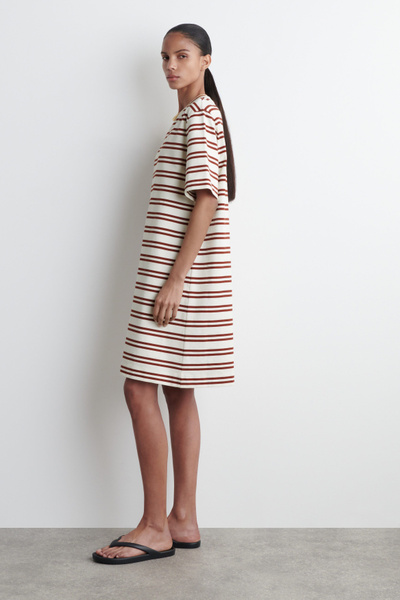 This season, the classic mini dress is renewed with an effortless appeal. Patterned with red stripes, this crew-neck piece is cut in a relaxed shape and crafted from cotton chosen for its naturally light feel and unrivaled softness.