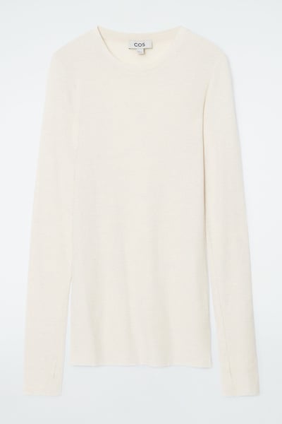Anchor your transitional wardrobe with this staple long-sleeved top. Offered in a neutral off-white hue, it’s crafted from premium merino wool and has a streamlined slim fit that’s ideal for layering. It’s designed with a classic crew neck collar and subtle thumbhole cuffs.