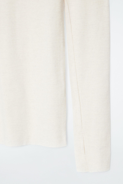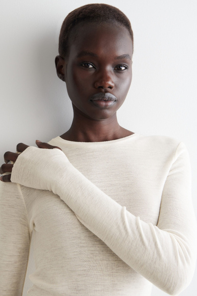 Anchor your transitional wardrobe with this staple long-sleeved top. Offered in a neutral off-white hue, it’s crafted from premium merino wool and has a streamlined slim fit that’s ideal for layering. It’s designed with a classic crew neck collar and subtle thumbhole cuffs.