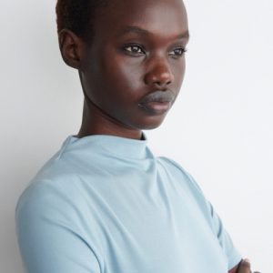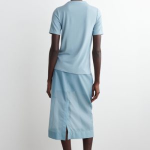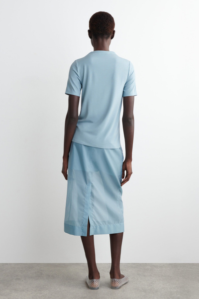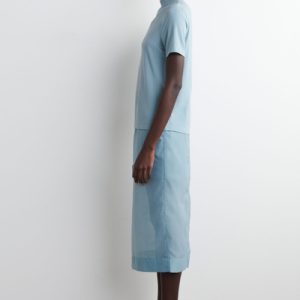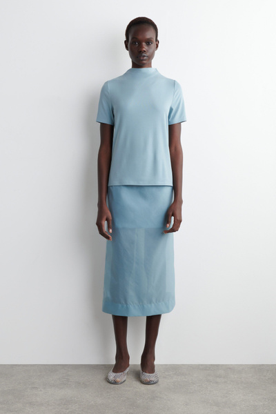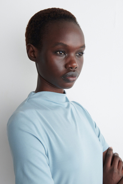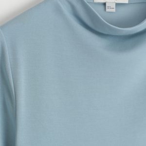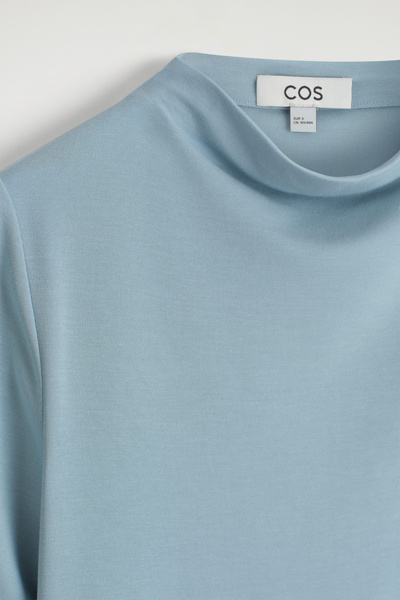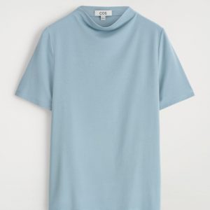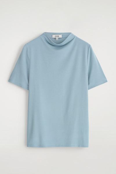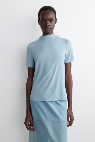 A subtle reimagining of the classic T-shirt, this piece is cut in a slim silhouette with a softly draped high neckline. It’s crafted from a modal-blend jersey, chosen for its softness and fluid feel, and rendered in a refreshing steel-blue tone that will pair effortlessly with the rest of your wardrobe.
