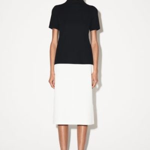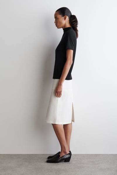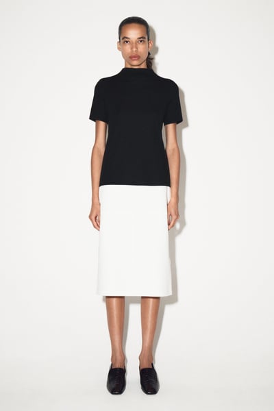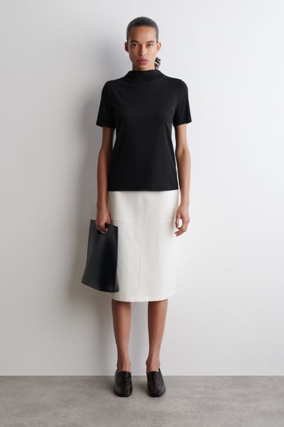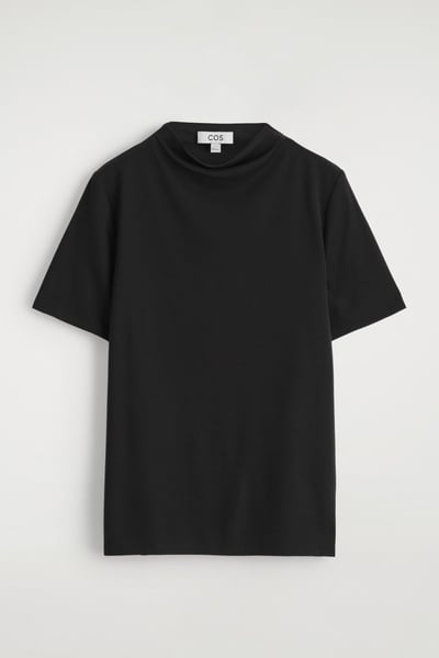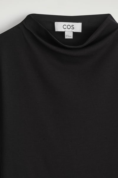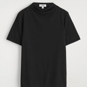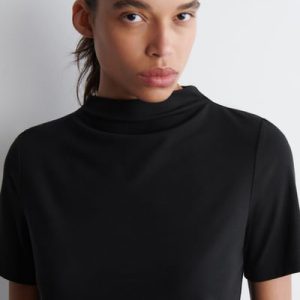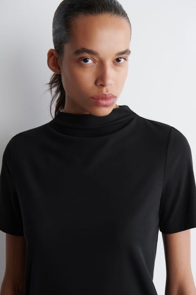 Introducing The Capsule Wardrobe: a seasonal evolution of permanent COS icons. A subtle reimagining of the classic T-shirt, this piece is cut in a slim silhouette with a softly draped high neckline. It’s crafted from modal-blend jersey, chosen for its softness and fluid handle, and rendered in an enduring black tone that will pair back effortlessly with the rest of your wardrobe.
