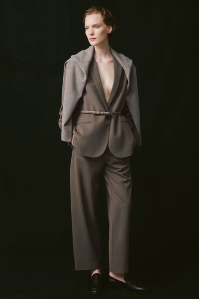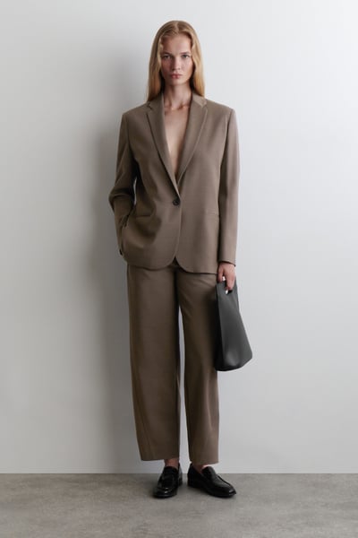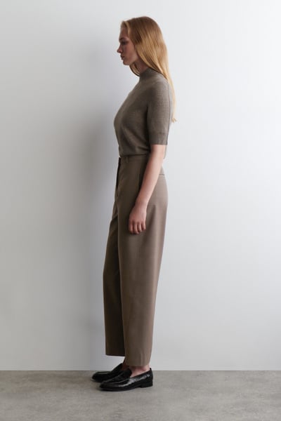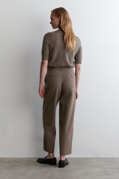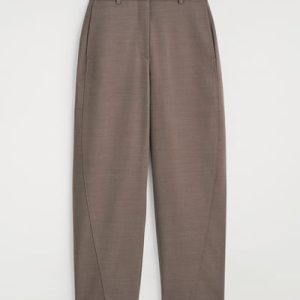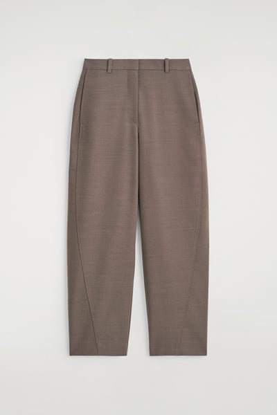 Introducing The Capsule Wardrobe: a seasonal evolution of permanent COS icons. Rendered in a rich mole tone, these merino wool-twill pants are cut in a modern barrel-leg shape and have forward-facing seams that accentuate the rounded silhouette. The adjustable tabs inside the waistband offer a perfected fit.