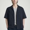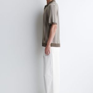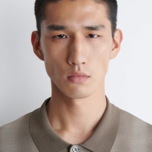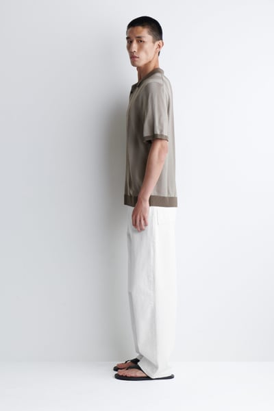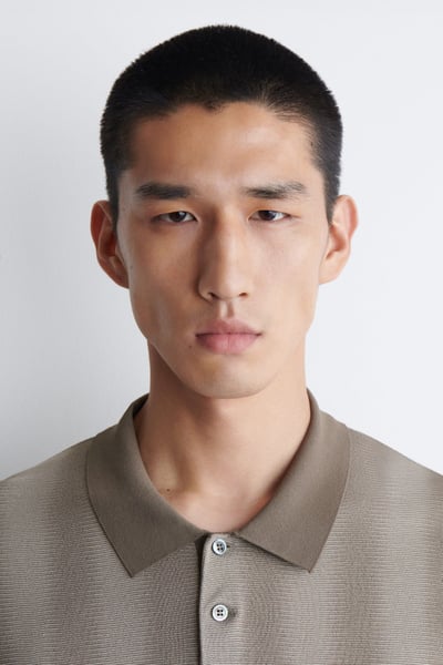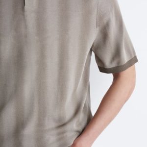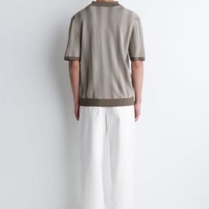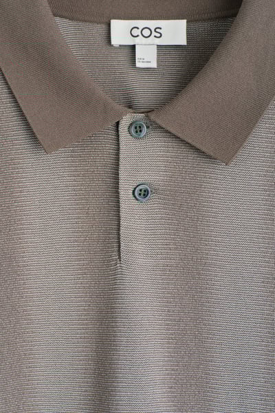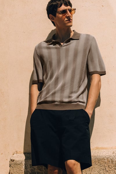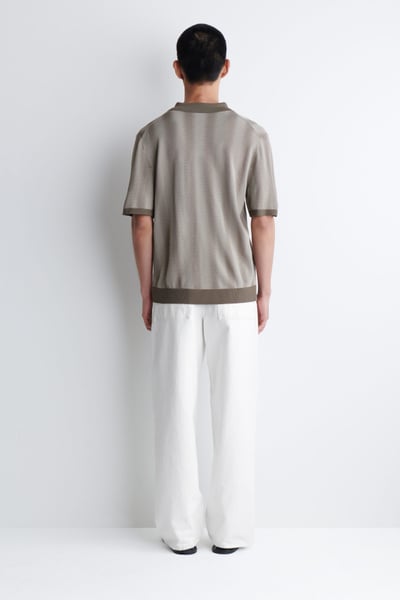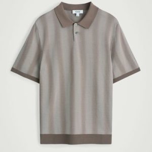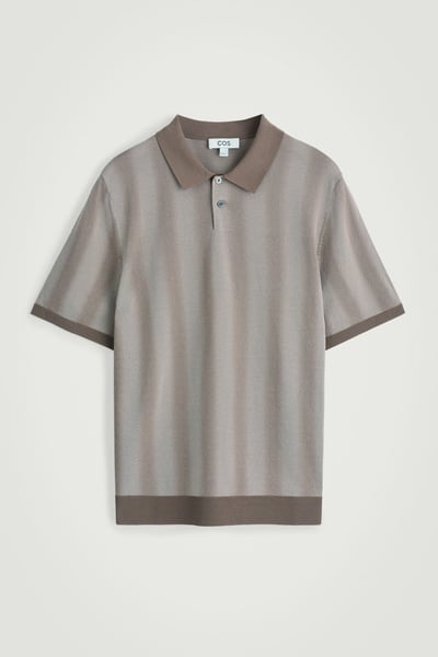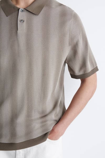The COS menswear team reimagines classic staples for the modern wardrobe. This knitted polo shirt is patterned with diffused stripes in a neutral mocha hue and features a ribbed collar, short sleeves, and hem for tactility.