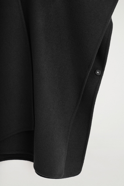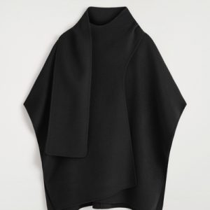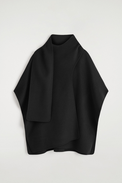 This sophisticated cape channels the effortless appeal of autumn/winter styling. It’s crafted from a merino wool blend that’s double-faced for a premium handle and designed with a tonal scarf that drapes around the neck.
