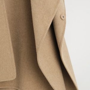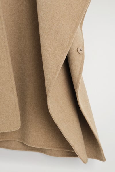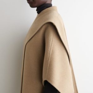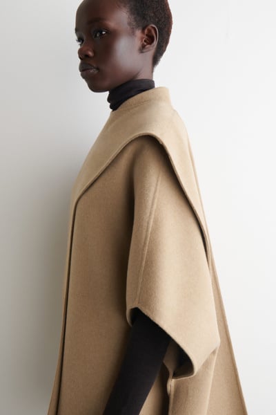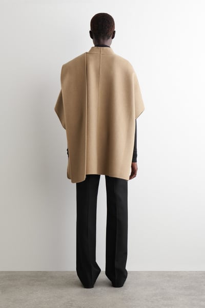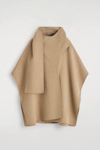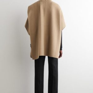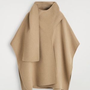 This sophisticated cape channels the effortless appeal of autumn/winter styling. It’s crafted from a merino wool blend that’s double-faced for a premium handle and designed with a tonal scarf that drapes around the neck.