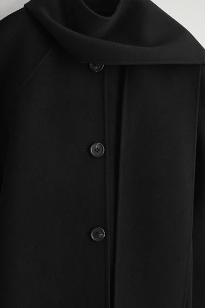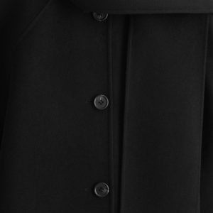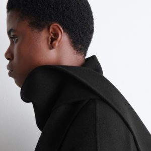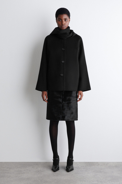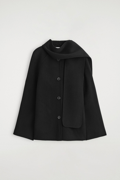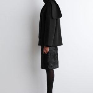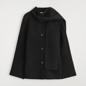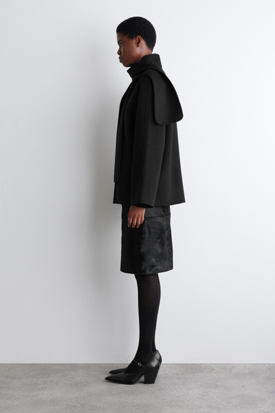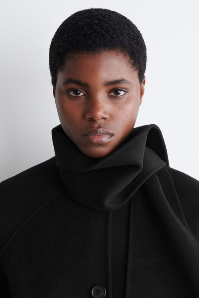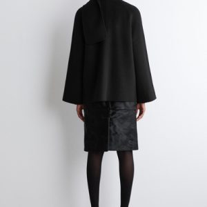 This season’s outerwear collection proposes defined silhouettes softened by exquisite materials. Rendered in an enduring black tone, this jacket is made from a wool blend that’s double-faced for a premium finish and designed with a scarf that drapes effortlessly over the shoulder.
