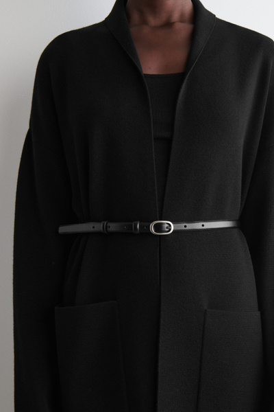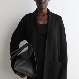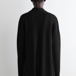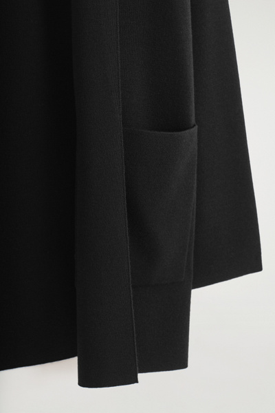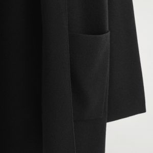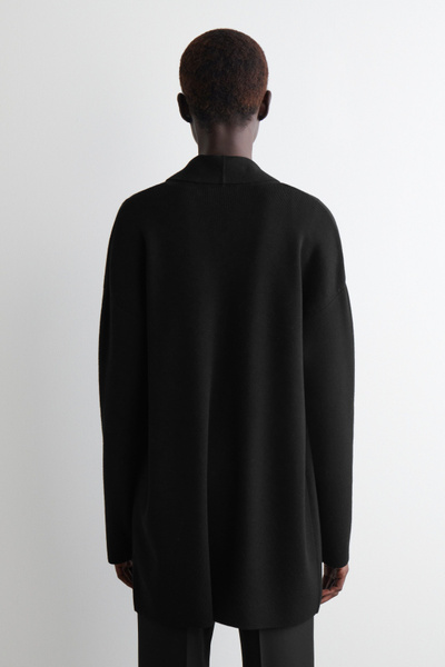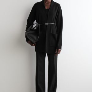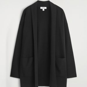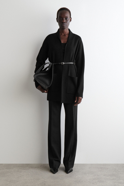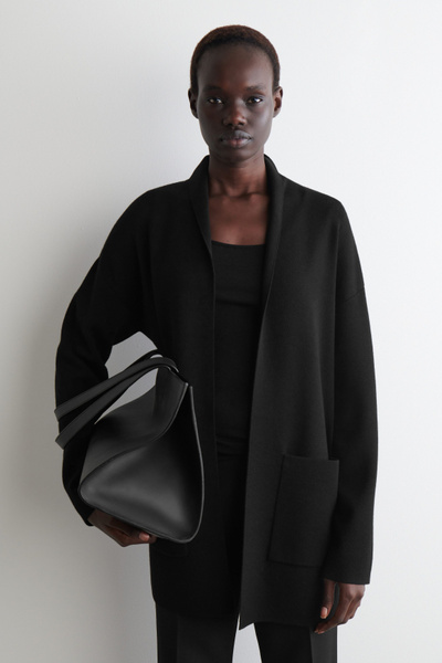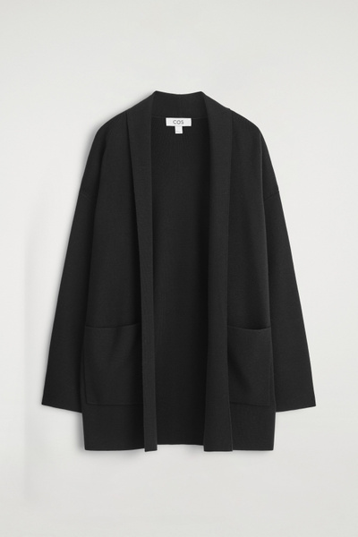This season, modern design details lend wardrobe classics a new attitude. Crafted from ultra-soft merino wool, this longline cardigan is designed with a draped collar and front patch pockets. It will form the basis of transitional layered looks.