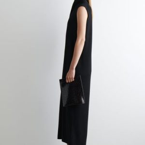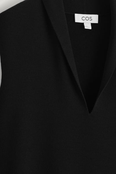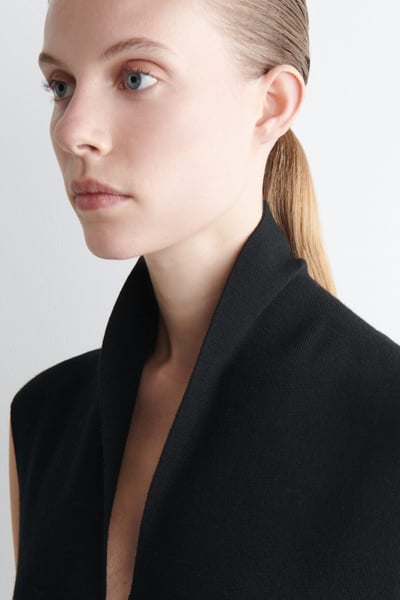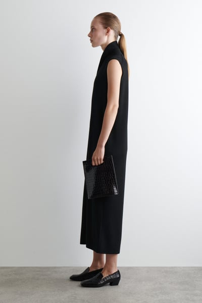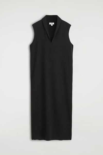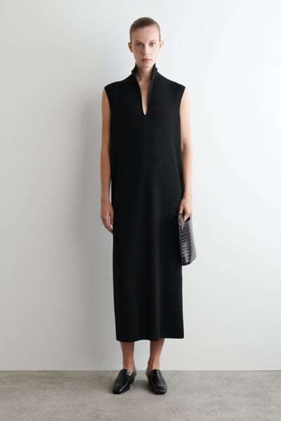 This season, modern design details lend wardrobe classics a new attitude. Crafted from ultra-soft merino wool, this refined midi dress is designed with a draped collar and sculptural V-neckline. Style it with simple mules.