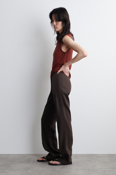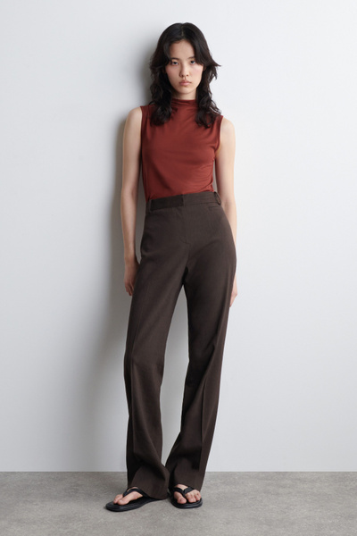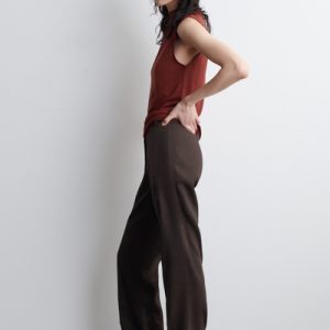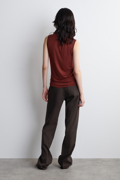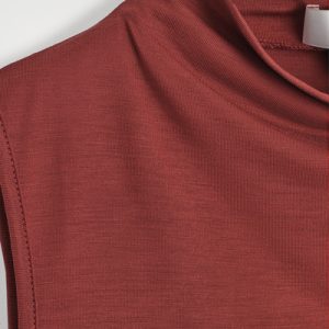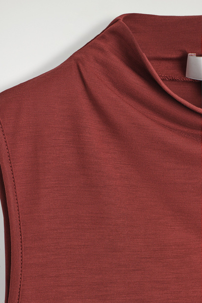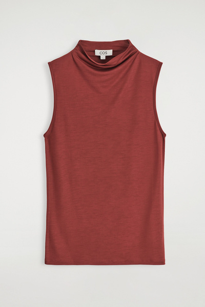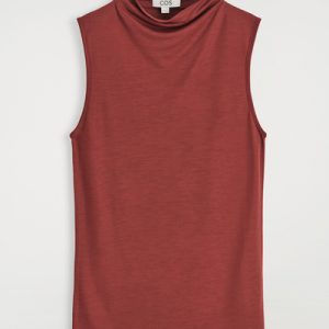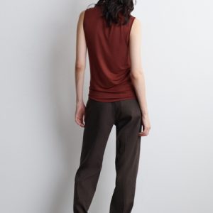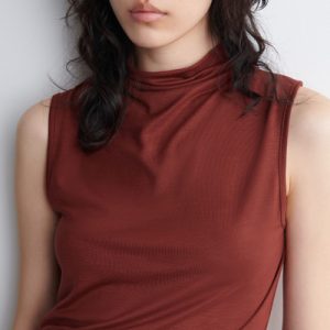 This season, wardrobe signatures are transformed through refined shapes and exceptionally soft fabrics. This modern tank top is designed with a draped turtleneck and a slim, form-fitting silhouette. It’s crafted from fluid TENCEL™ Lyocell and rendered in a rust-red tone.