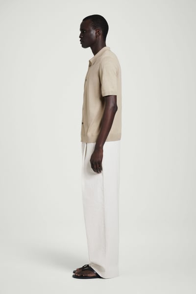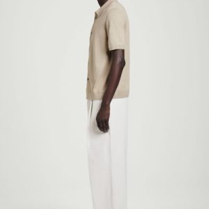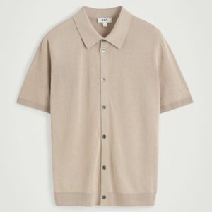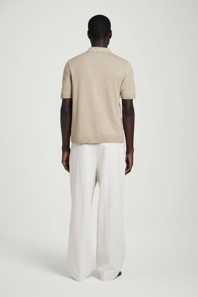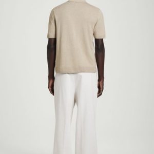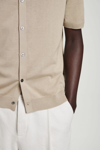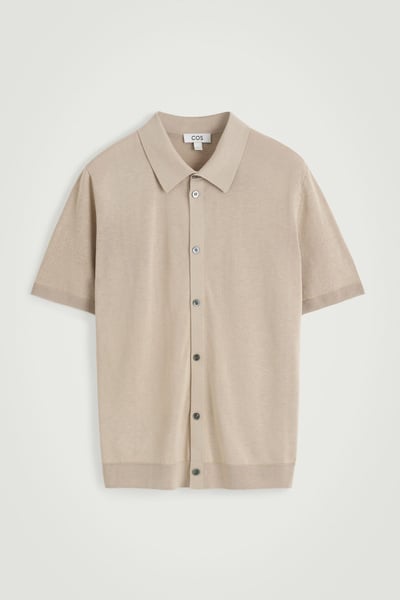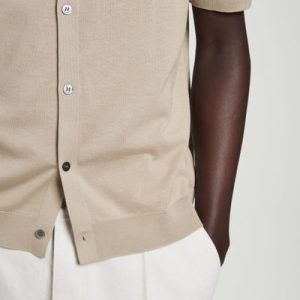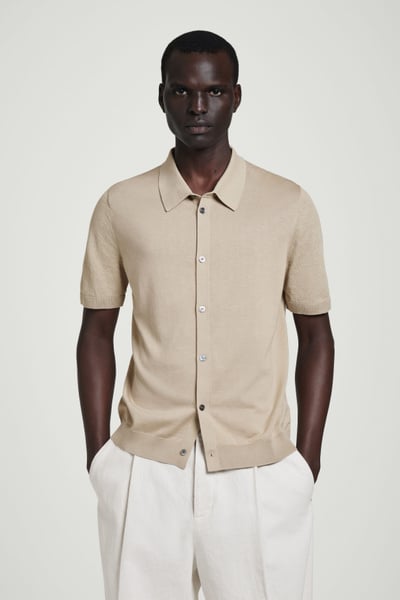 A reconsidered classic, this knitted shirt is crafted from linen and cotton with mulberry silk for a premium finish. It’s offered in a muted sand hue and features mother-of-pearl buttons, a Milano-knit collar, and ribbed trims.