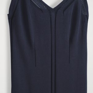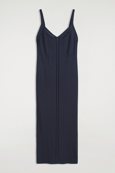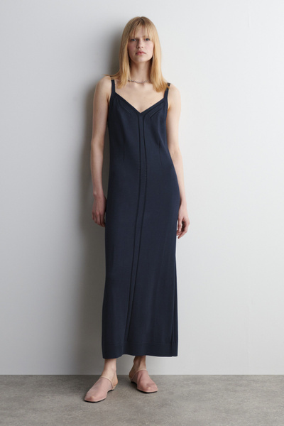 This knitted slip dress lends itself to summer dress codes. Rendered in an enduring navy tone, it features a sophisticated V-neckline and is detailed with pointelle trims and shaped seams. Style it with barely-there sandals.