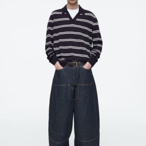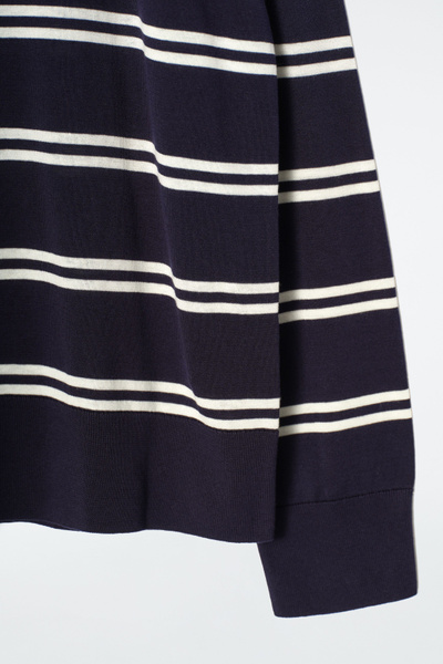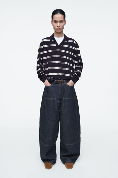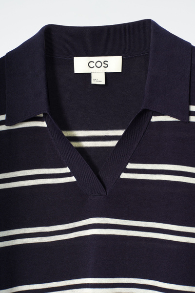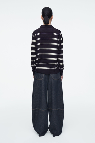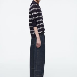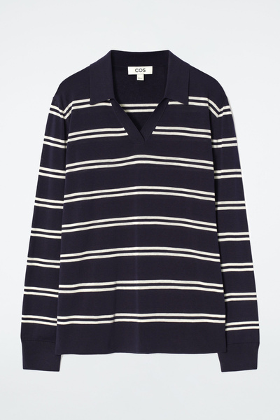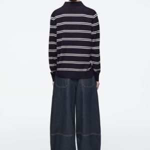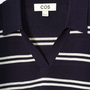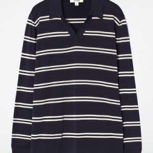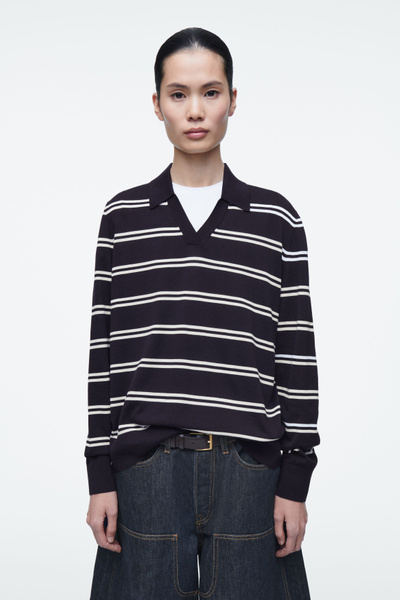 This season, the womenswear team offer a refined take on the classic polo. Decorated with bold stripes, it’s knitted from a blend of recycled mulberry silk and cotton and has an open collar for an effortless finish. Style it with denim.