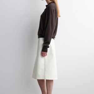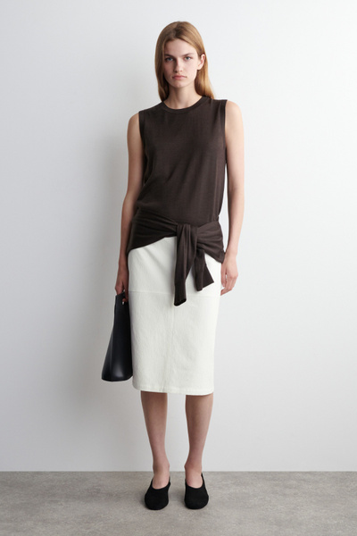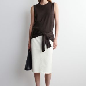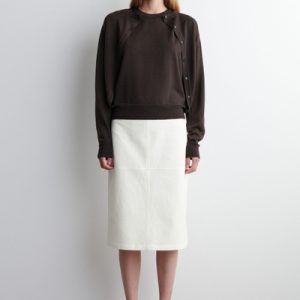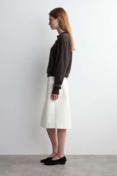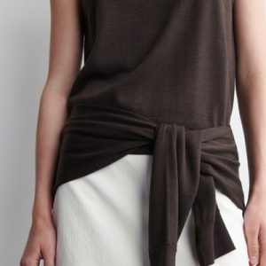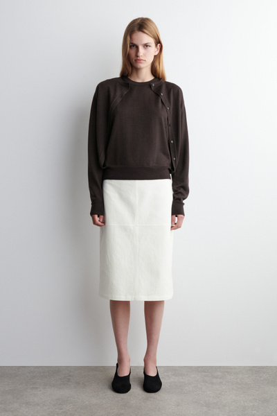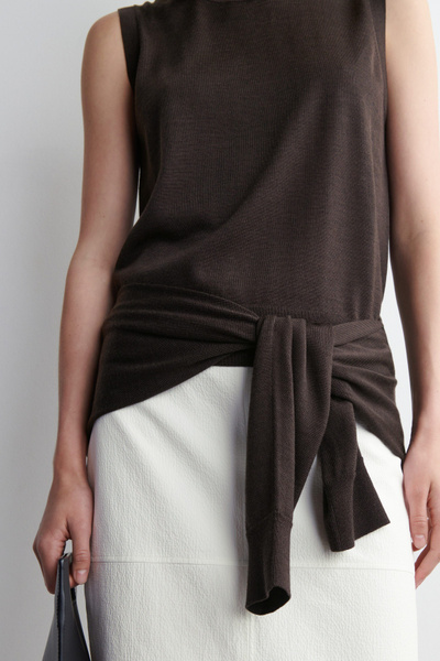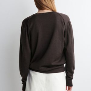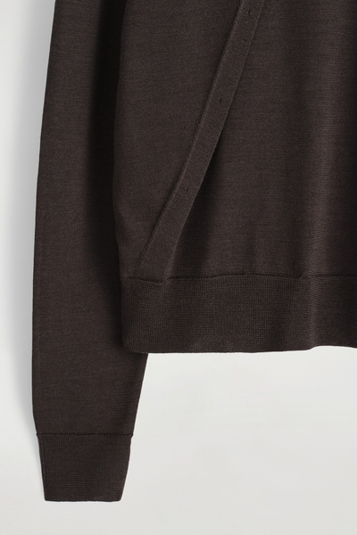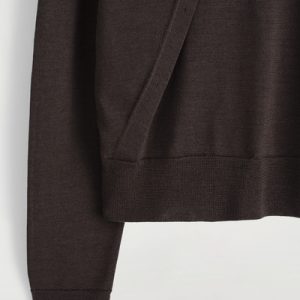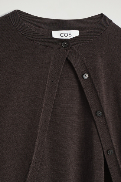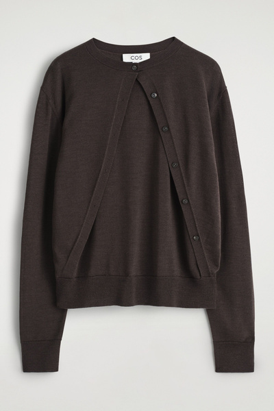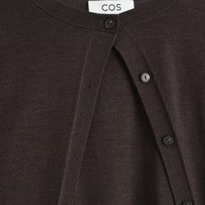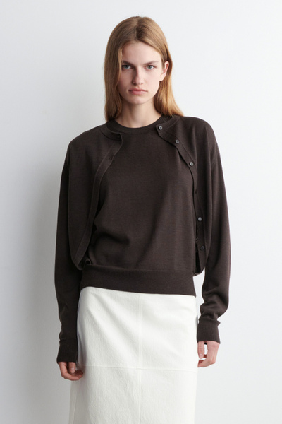 This understated piece marries the design of a cardigan and vest, creating a layered look in one silhouette. It’s knitted from ultra-fine merino wool that’s soft to the touch and finished with ribbed trims and a neat row of buttons. The deep espresso hue complements the rich tones of the season.
