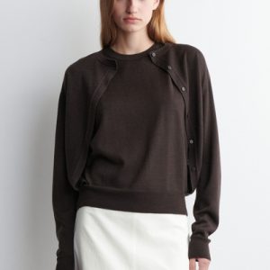This understated piece marries the design of a cardigan and vest, creating a layered look in one silhouette. It’s knitted from ultra-fine merino wool that’s soft to the touch and finished with ribbed trims and a neat row of buttons. The deep espresso hue complements the rich tones of the season.