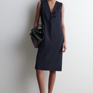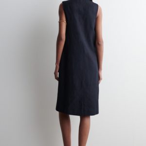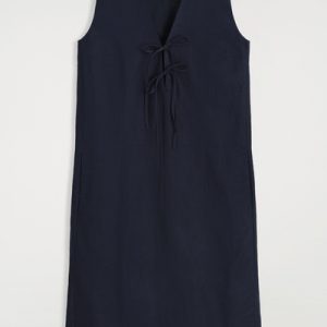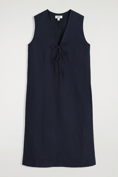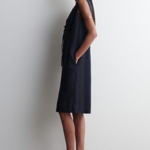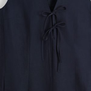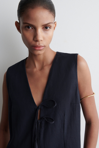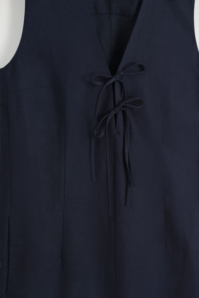 Softening the codes of classic tailoring, this vest midi dress is designed with a V-neck, delicate front ties, and waisted darts that subtly sculpt the silhouette. It’s crafted from ECOVERO™ Viscose, linen, and cotton for lightness and breathability, while the vent at the back offers movement.