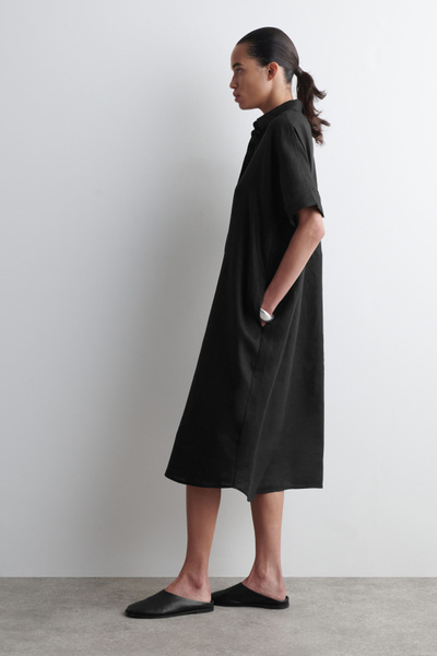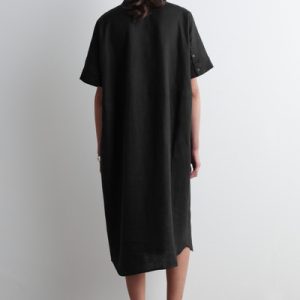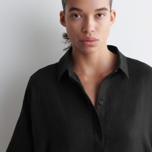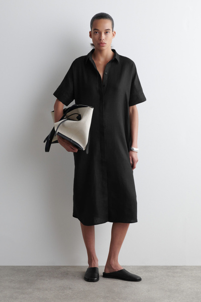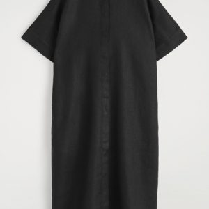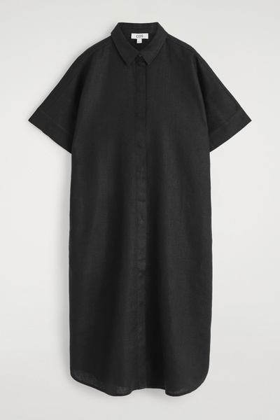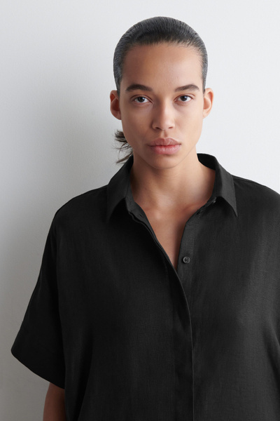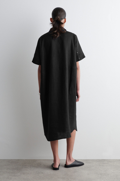 This boxy shirt dress proposes a laid-back take on summer dressing. Offered in an enduring black tone, it’s crafted from pure linen that’s naturally lightweight and designed with a pointed collar, short sleeves and a circle-cut seam.
