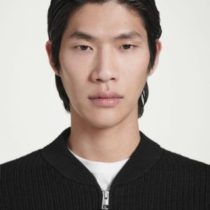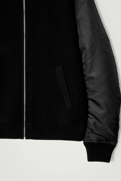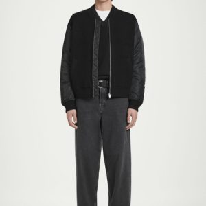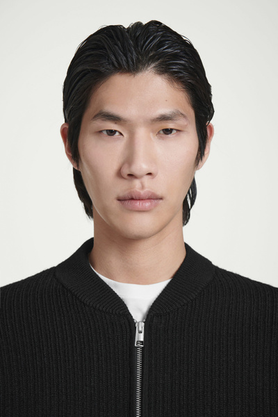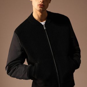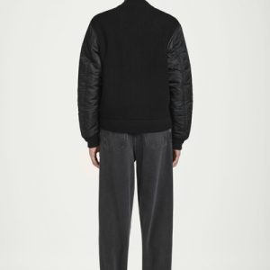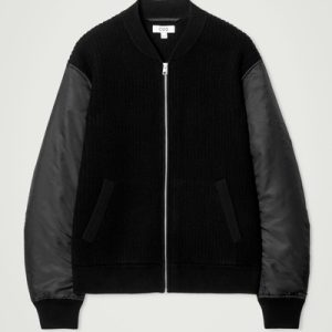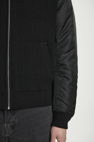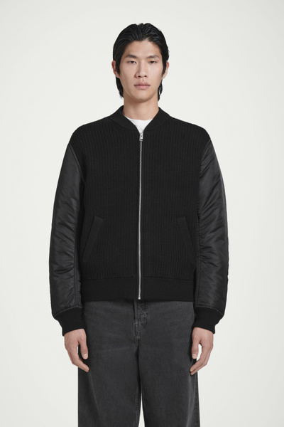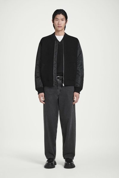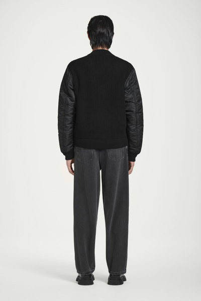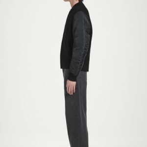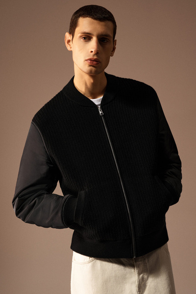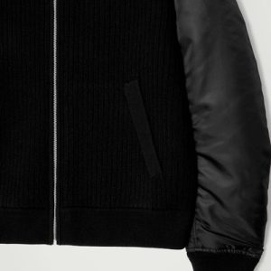 The menswear team reimagines a workwear staple: the classic bomber jacket. This version features a knitted merino wool body and contrasting nylon sleeves, both in a versatile black tone that’s easy to style. It’s finished with pockets at the front and ribbing on the collar and cuffs.