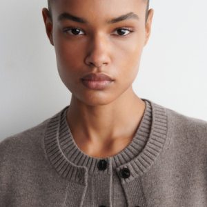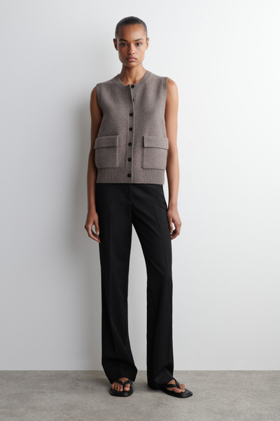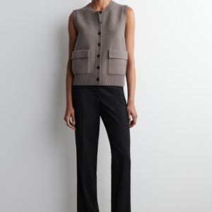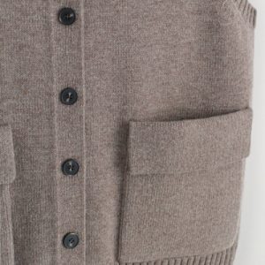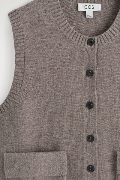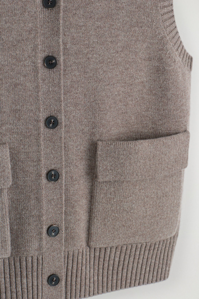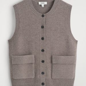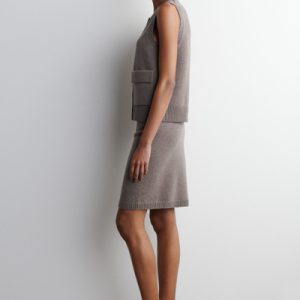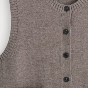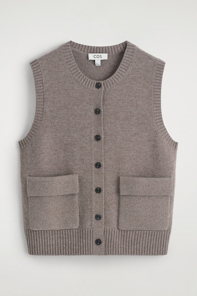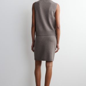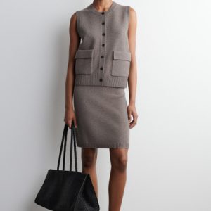 Rendered in a rich mole hue, this modern vest is crafted from merino wool that has been specially washed for a supremely soft hand feel. It features contrasting buttons, front pockets and a rounded neck that’s ribbed for a chunkier look. Style it as a coord with the matching mini skirt.