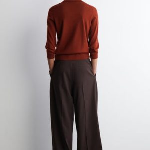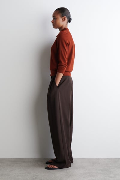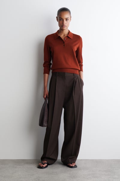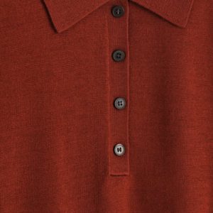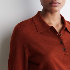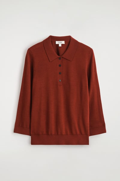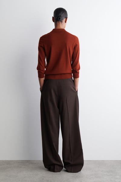 The womenswear team reimagines the classic polo through a modern lens. Crafted from premium merino wool, this piece is designed with a pointed collar, three-quarter-length sleeves, and finely ribbed trims.