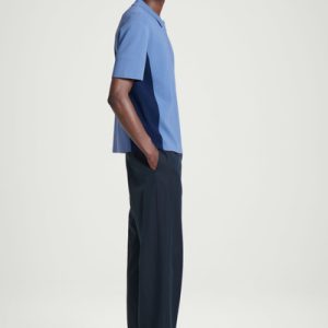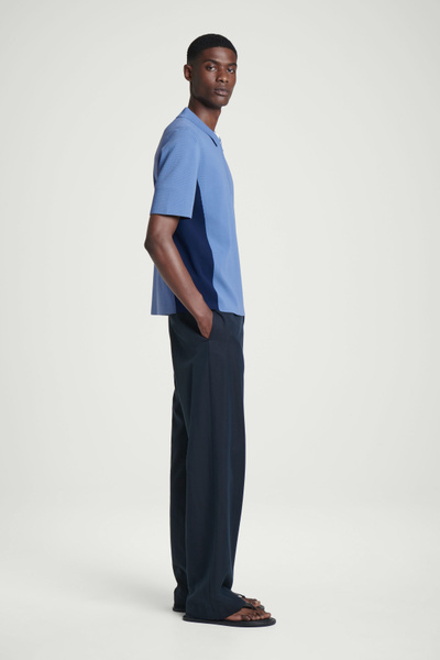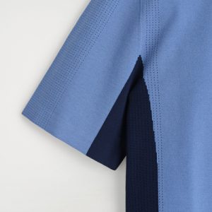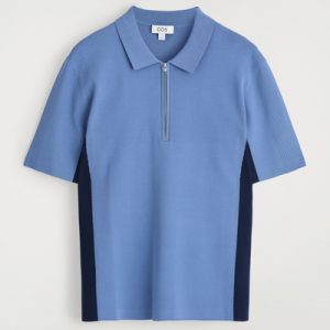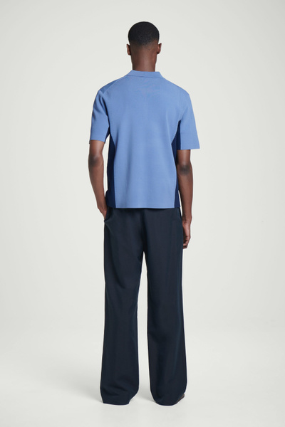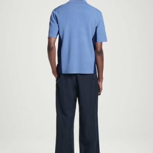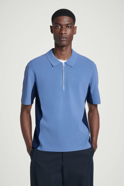 This knitted polo shirt borrows from classic sportswear. Cut in a relaxed shape, it’s color-blocked in shades of blue and navy with mesh detailing perforating the edges for breathability. It’s finished with a modern zip-up collar.