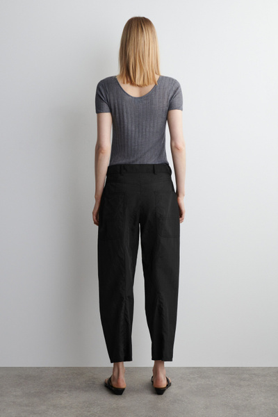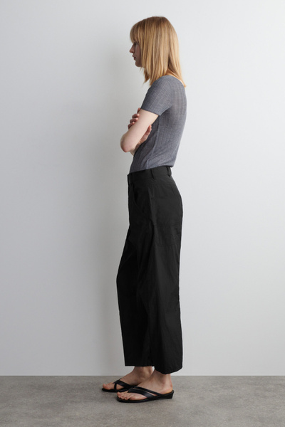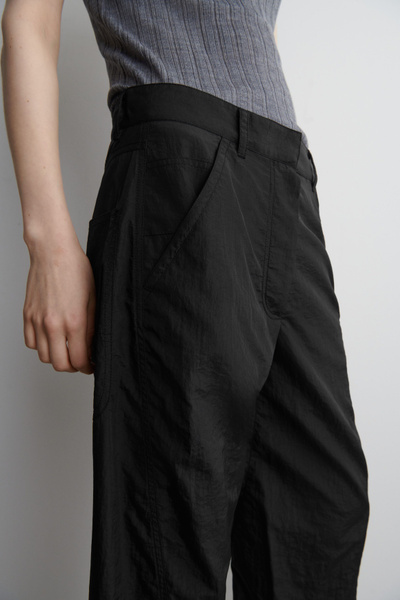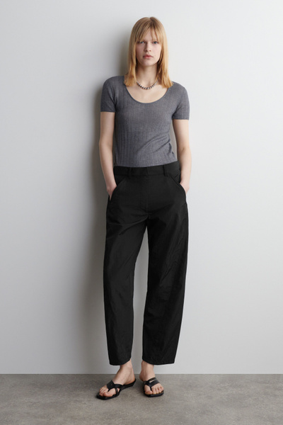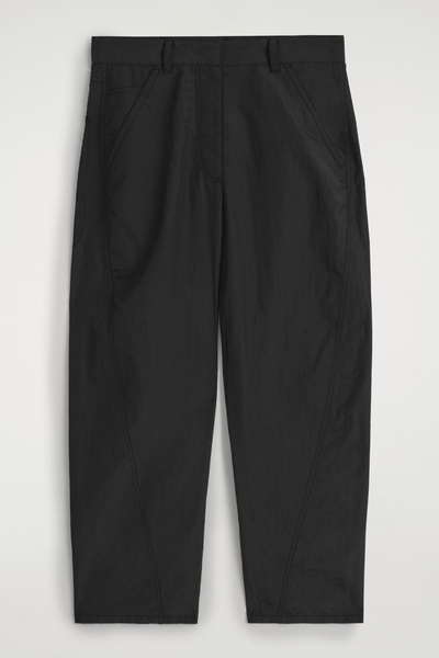 The womenswear team reimagines tailoring codes through sculptural shapes and modern fabrics. Crafted from recycled nylon, these paneled pants are cut in a barrel-leg silhouette that falls to the ankle. Style them with thematching blazer for a contemporary take on suiting.