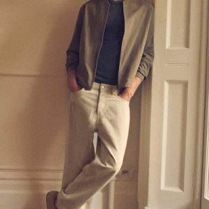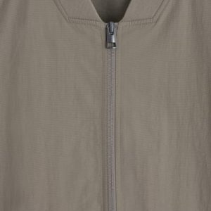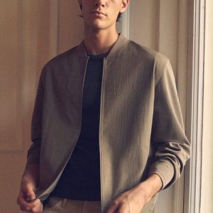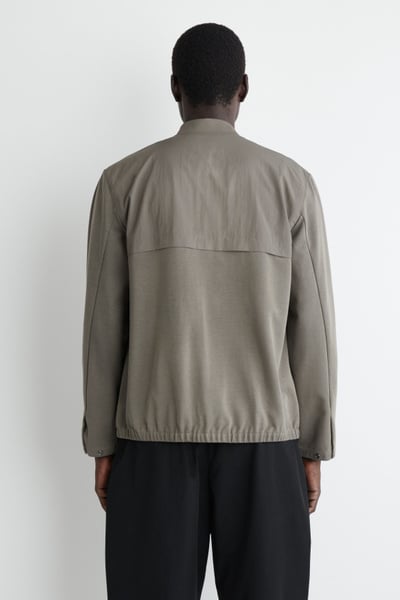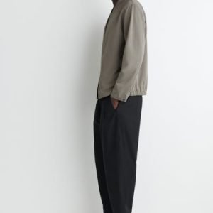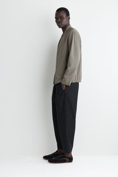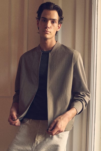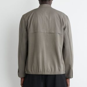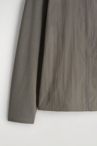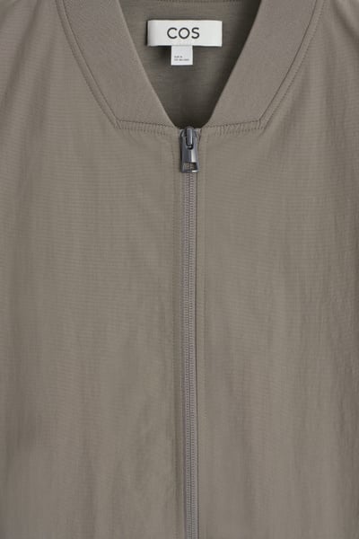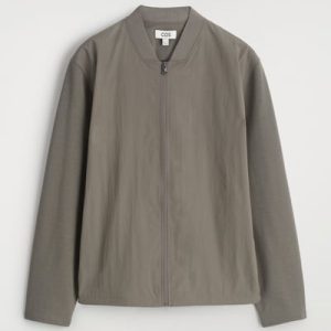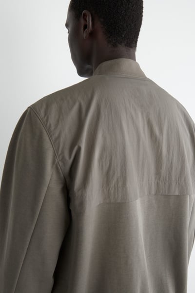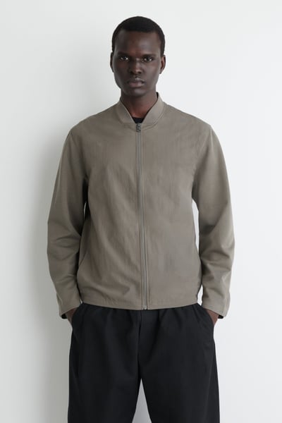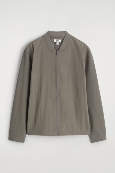 The COS menswear team reimagines the classic bomber jacket this season. Cut in a relaxed shape, it’s offered in a gray-brown tone and paneled with nylon at the front and soft cotton jersey at the back and sleeves. It’s finished with a ribbed band collar and a modern zipper.