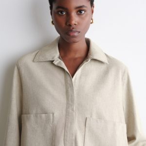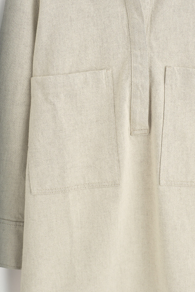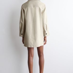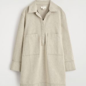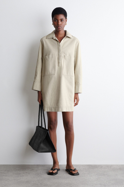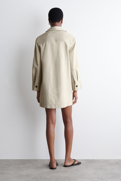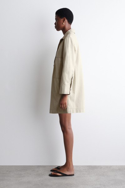 This modern shirt dress channels the relaxed appeal of the weekend wardrobe. It’s made from organic-cotton denim that’s washed a neutral oatmeal hue and features a spread collar, oversized patch pockets and long, wide sleeves.