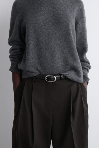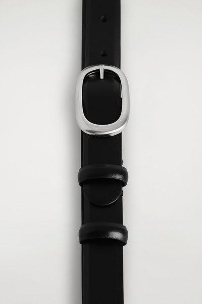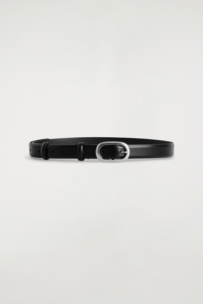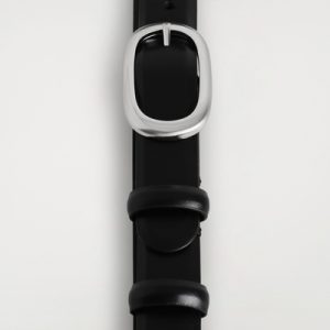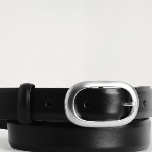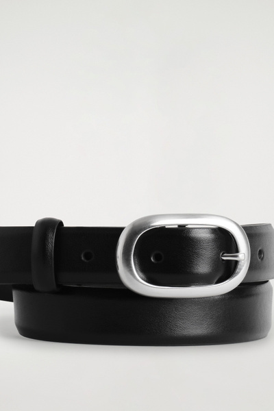 This refined belt is crafted from supple chrome-free leather in an enduring black tone and closes with a sculptural silver-tone oval buckle. Style it with tailoring or denim.