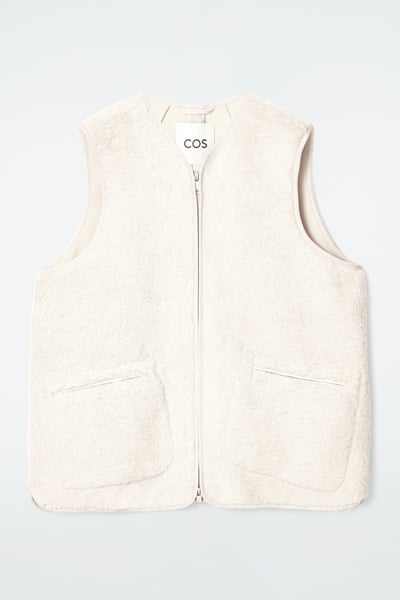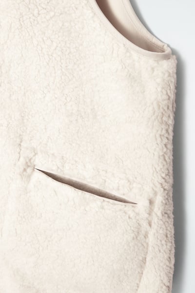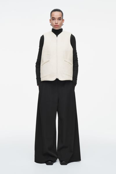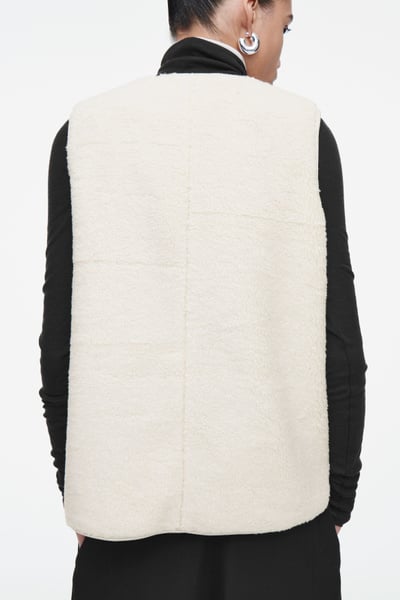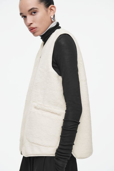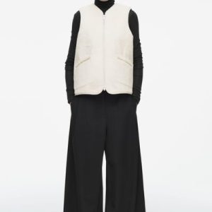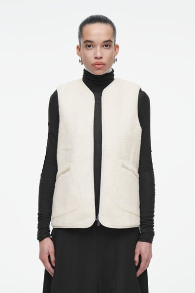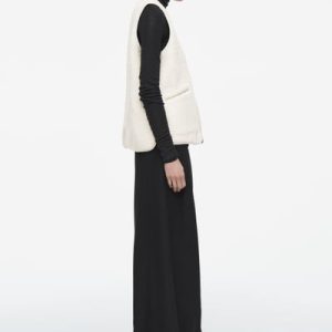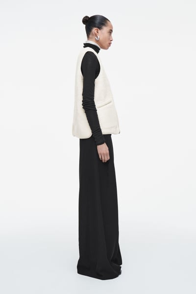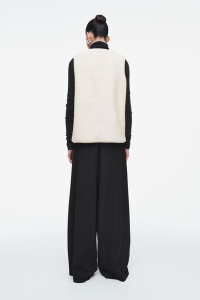 This faux shearling vest channels both coziness and refinement for the fall/winter season. Offered in a soft ivory tone, it features a V-neckline and front welt pockets that you can rest your hands in. It’s cut in a boxy, oversized shape and finished with a smooth lining and tonal binding.