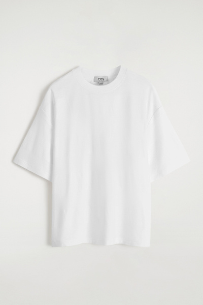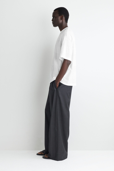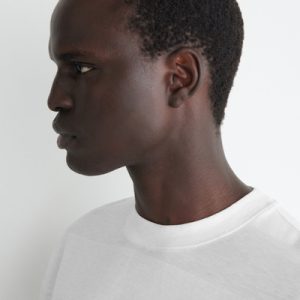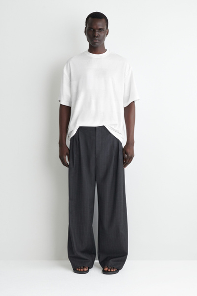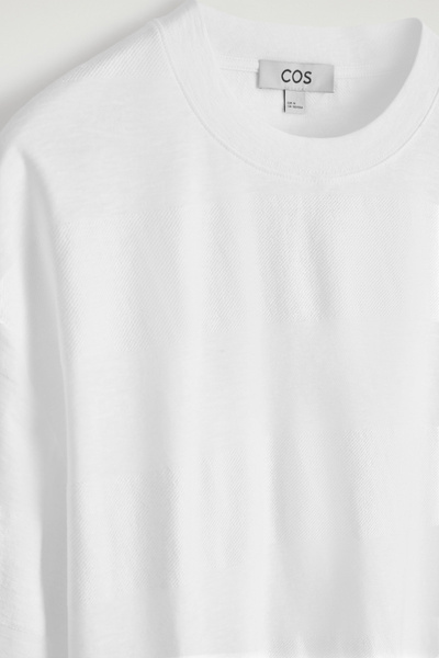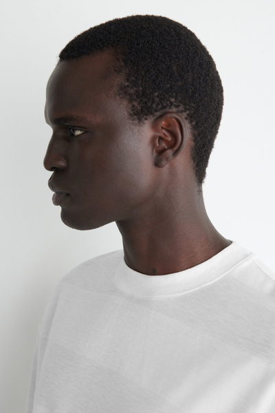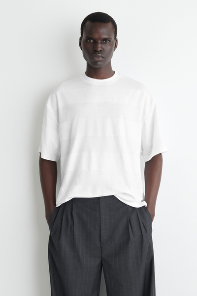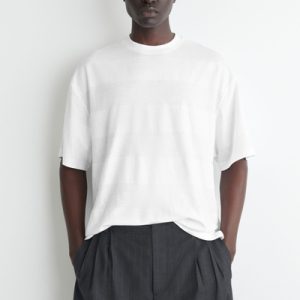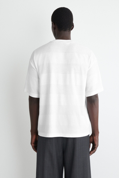 The menswear team renews the classic T-shirt with unexpected details. This crew-neck style is crafted from soft cotton with hints of linen for breathability and woven in a subtle block-stripe pattern. It’s cut in an oversized shape for laid-back appeal.