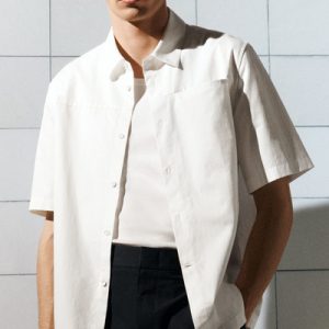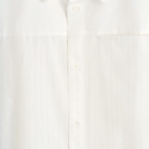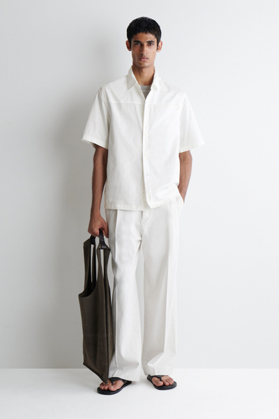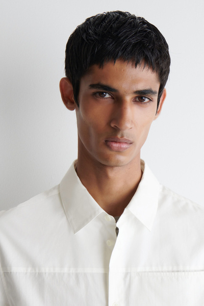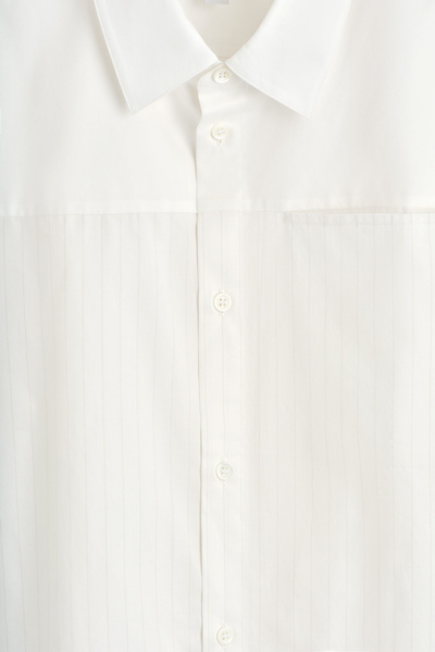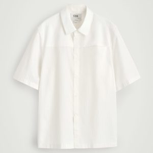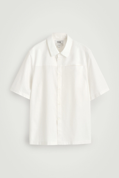 The COS shirting collection spotlights intuitive pieces that translate from smart to casual. Crafted from ultra-soft Pima cotton, this short-sleeved piece is patterned with modern pinstripes that subtly contrast the solid white collar and shoulders. It has a discreet pocket at the chest and fastens with premium mother-of-pearl buttons.