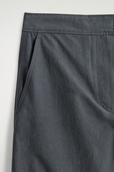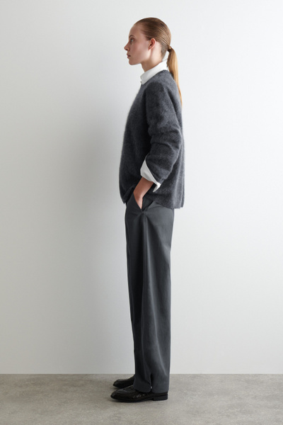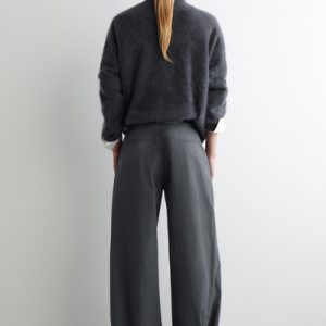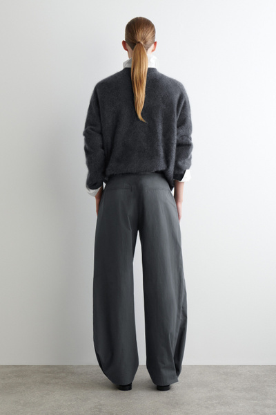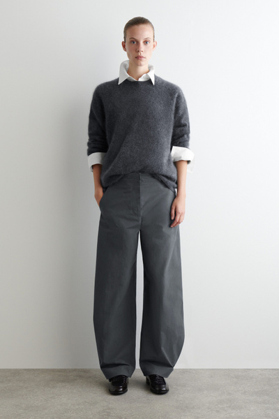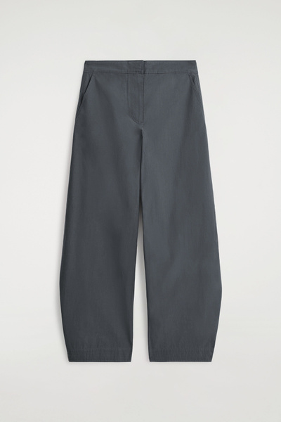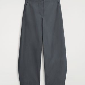 These modern pants channel an effortless refinement. Cut in a barrel-leg silhouette, they are crafted from premium Pima cotton, selected for its soft handle and natural structure, and designed with subtle snap studs at the ankles to adjust the shape. Style them with a classic sweater for a refined off-duty look.
