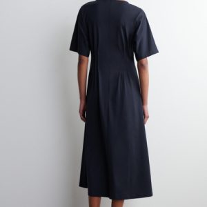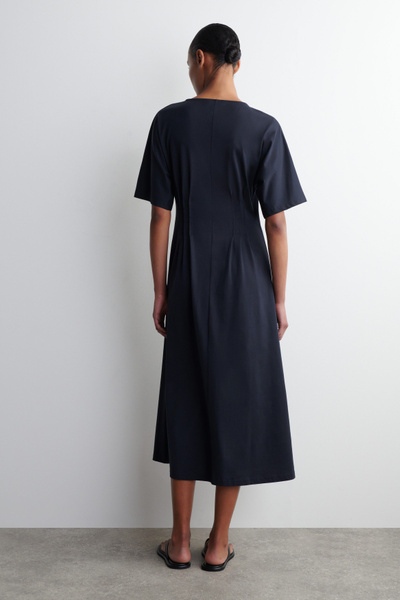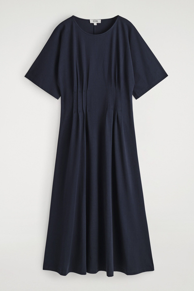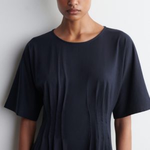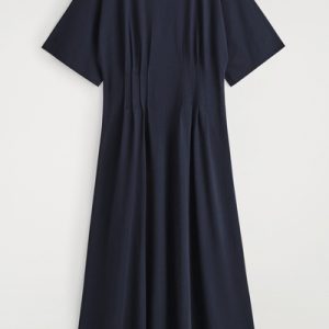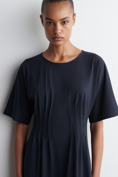 This refined midi dress channels a modern elegance. Delicate pintucked pleats define the waist, creating a sculptural silhouette that cascades into a softly flowing skirt. Rendered in airy, lightweight cotton, it’s an effortless choice for sun-drenched days.